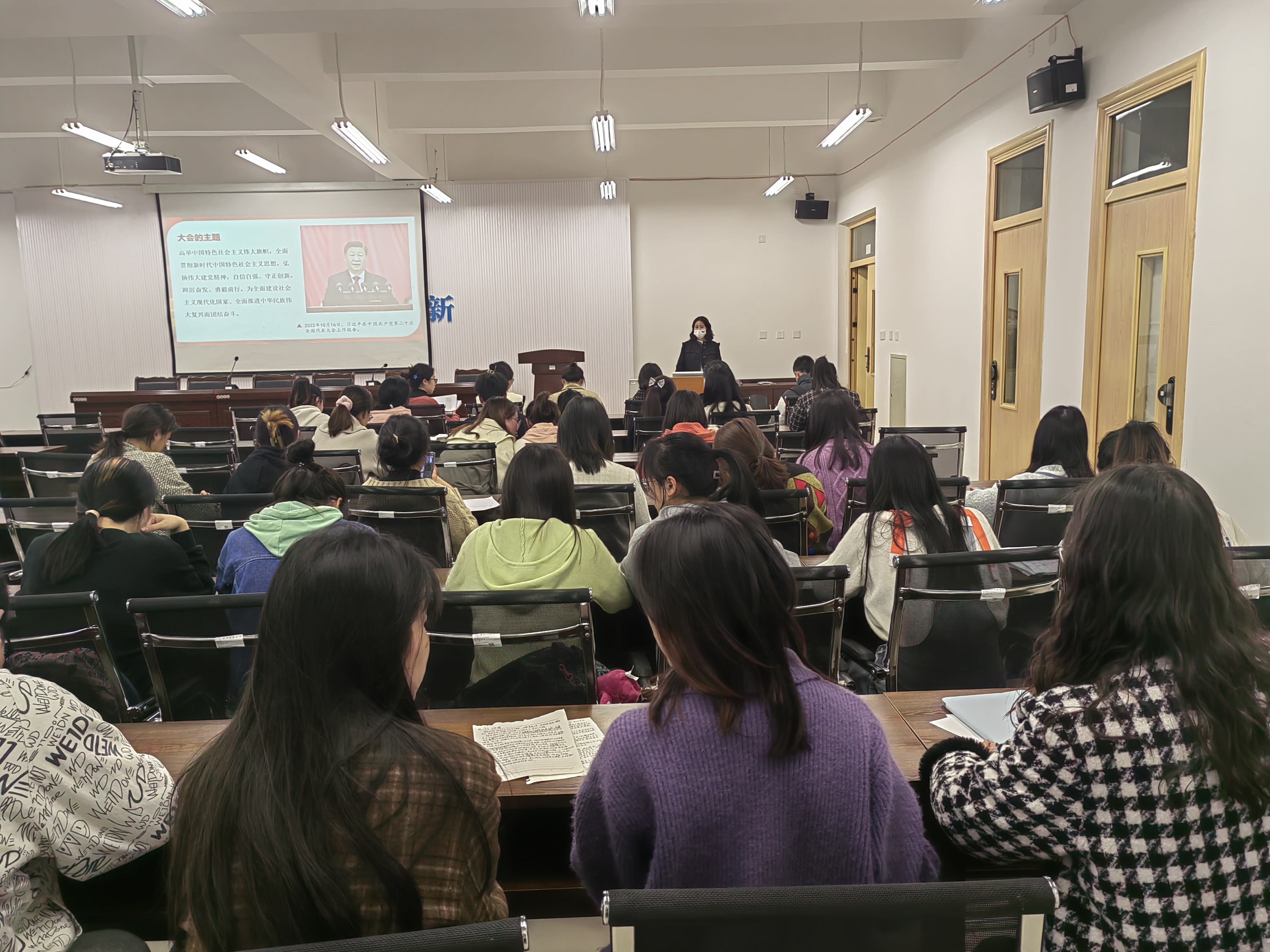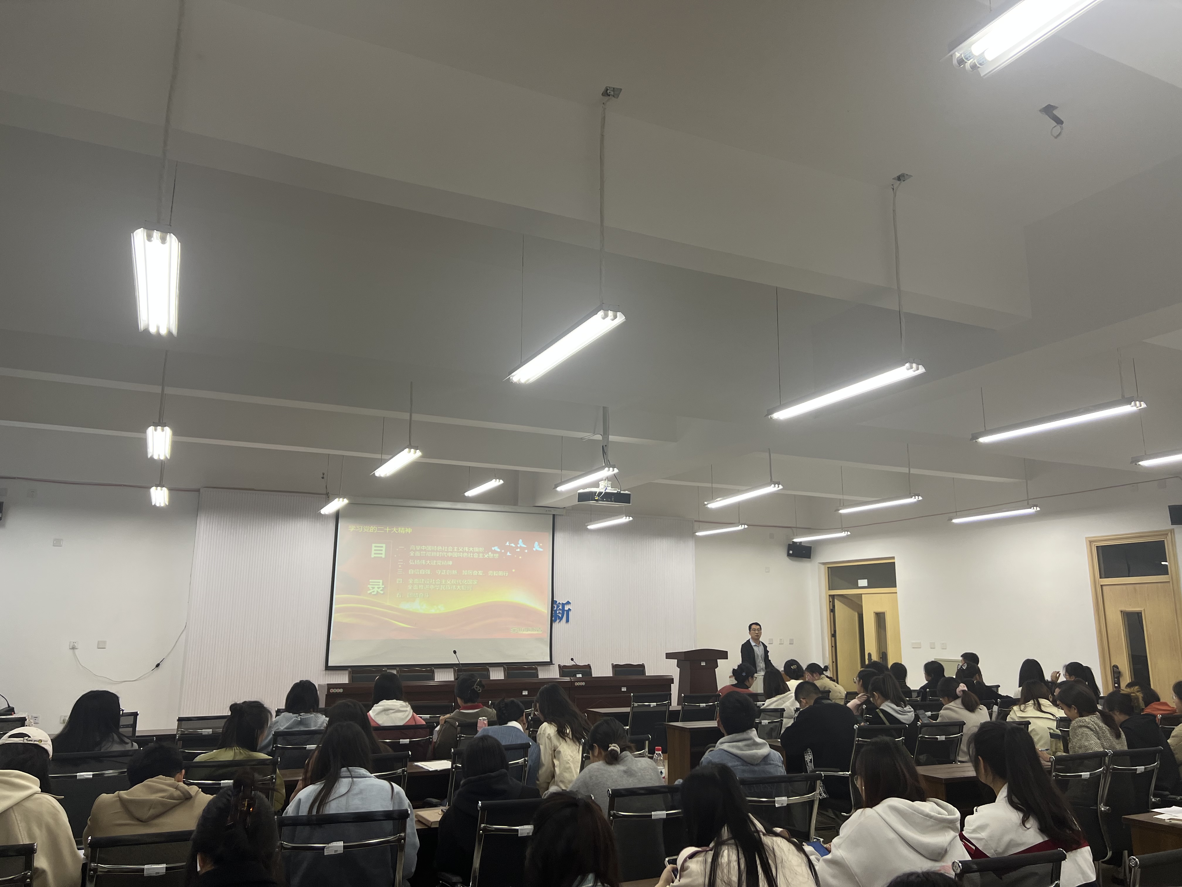 党课以时间为线,通过对比历次党的代表大会主题,从历史发展的角度研究党的二十大报告的主题:高举中国特色社会主义伟大旗帜,全面贯彻新时代中国特色社会主义思想,弘扬伟大建党精神,自信自强、守正创新,踔厉奋发、勇毅前行,为全面建设社会主义现代化国家、全面推进中华民族伟大复兴而团结奋斗。