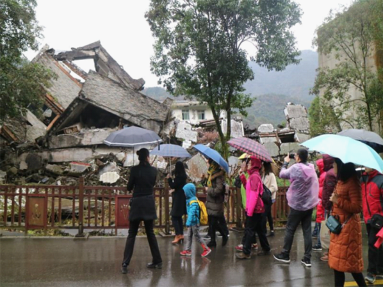 震中映秀,青山苍翠,岷江奔腾。漩口中学地震遗址安静肃穆,纪念表盘上的时针、分针永远定格在14时28分。公司楼体斑驳不堪,断壁残垣诉说着当年的悲痛,而五星红旗一如当年继续竖立在公司之中,鼓舞着人们。遗址西侧矗立的汶川特大地震记事浮雕墙,用铭文记述着地震灾难造成的巨大损失和中国人民奋起抗震救灾和灾后重建的伟大壮举。
