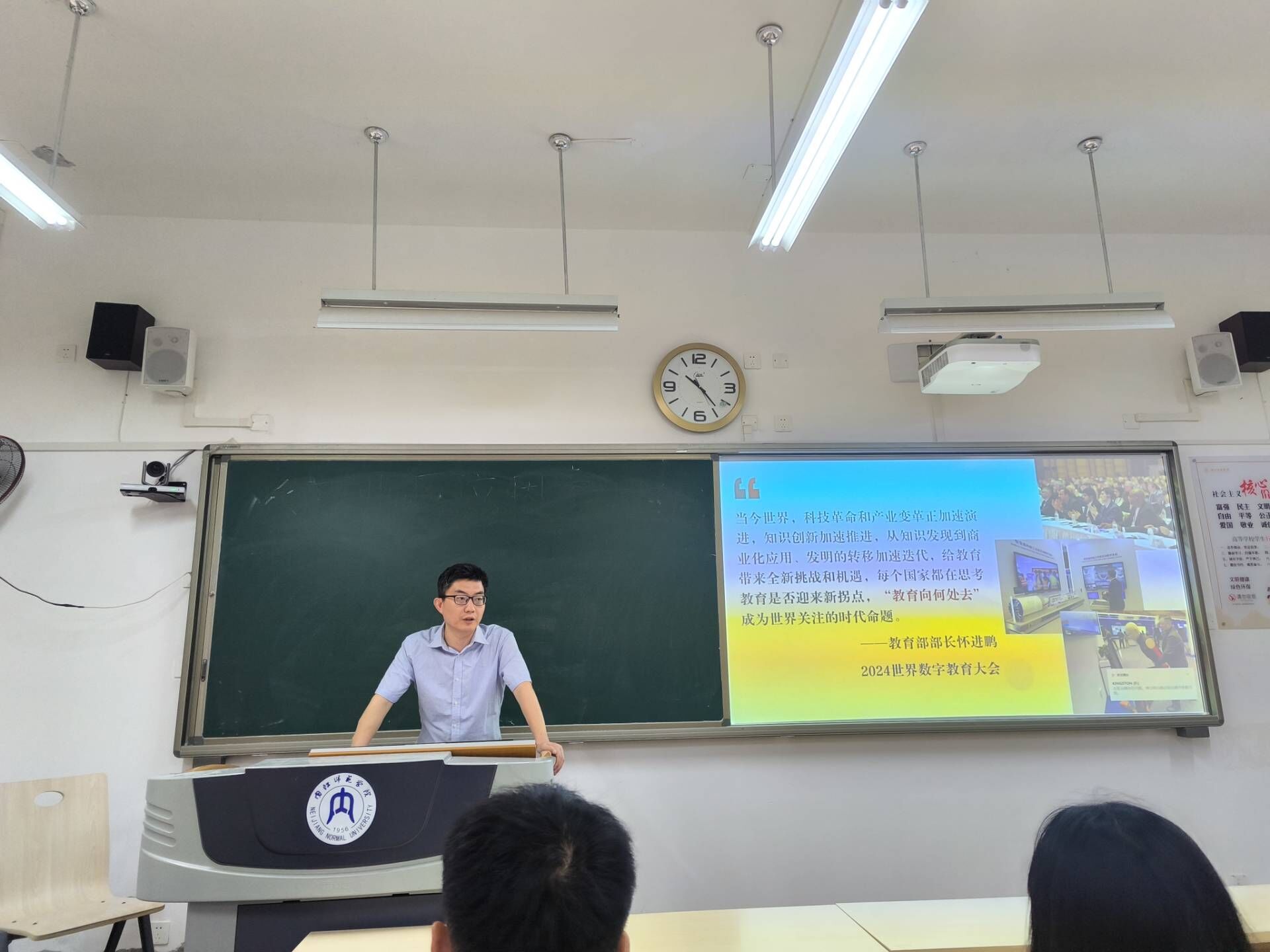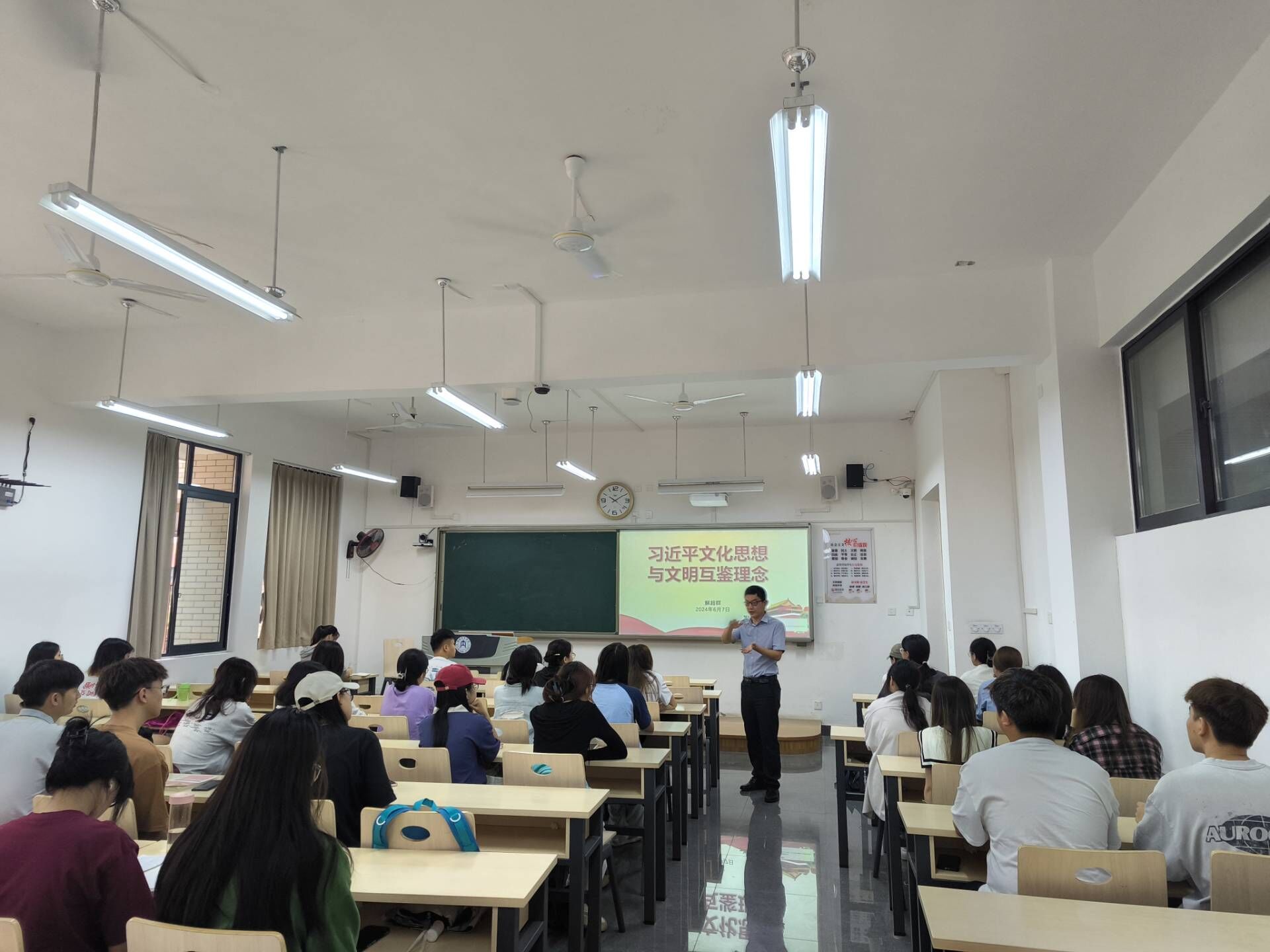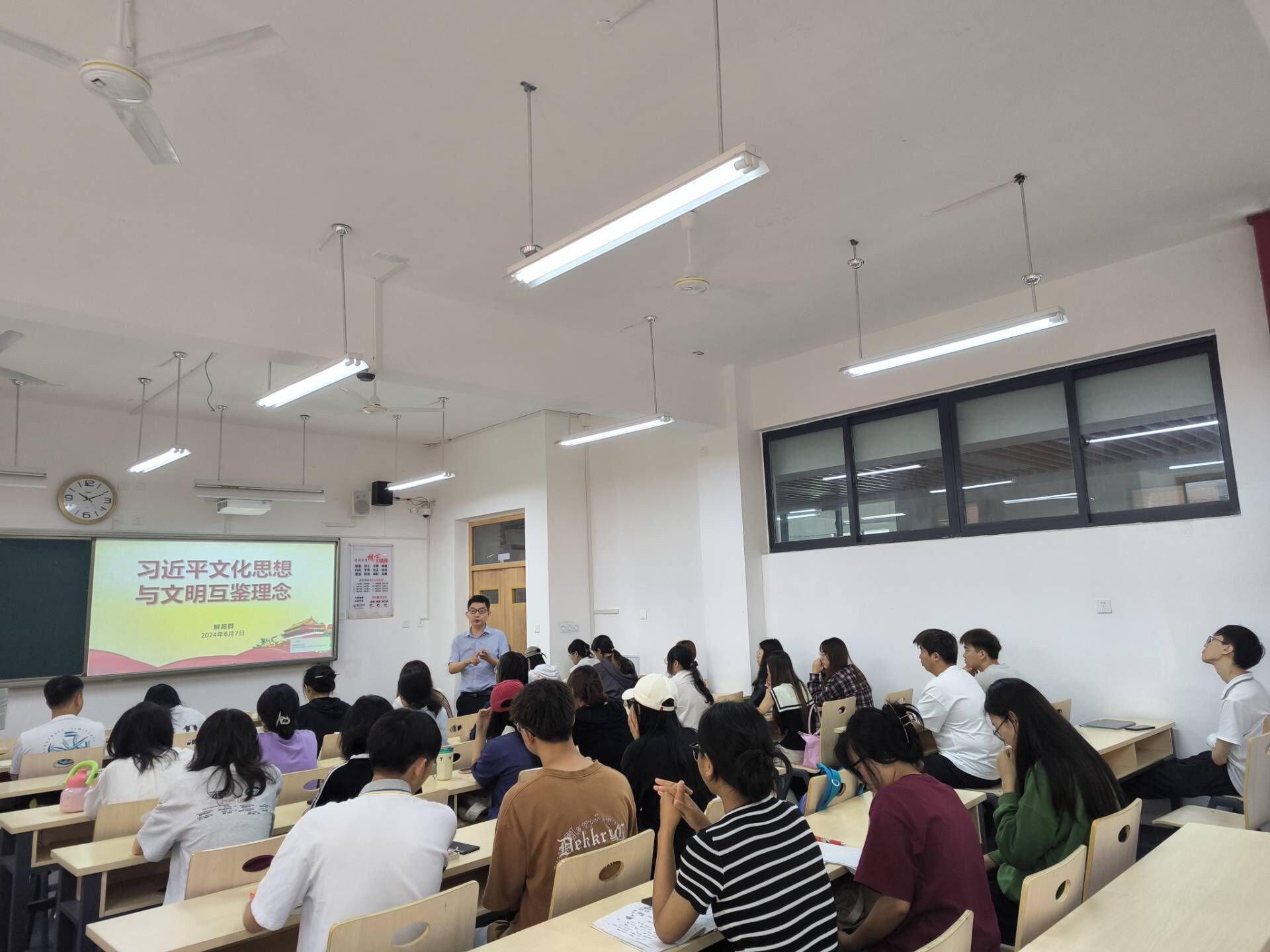 为了增强同学们的国际视野,培养他们的跨文化交际能力,6月7日10:00,太阳成集团tyc234cc副经理、教工第一党支部书记解超群在明德楼B215为2022级2班作“习近平文化思想与文明互鉴理念”主题宣讲,辅导员苟章艳及2022级2班全体同学参会。