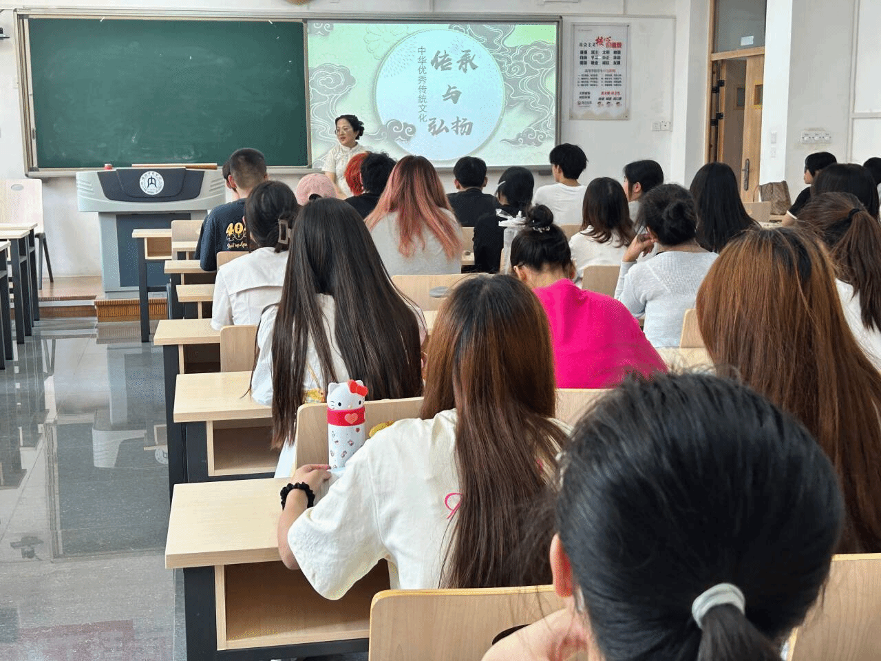 6 月 17 日中午,科技处副处长周琼在明德楼B218为联系班级2023级7班作“传承经典,文化润心”专题宣讲,班主任孙倩及2023级7班全体同学参会。