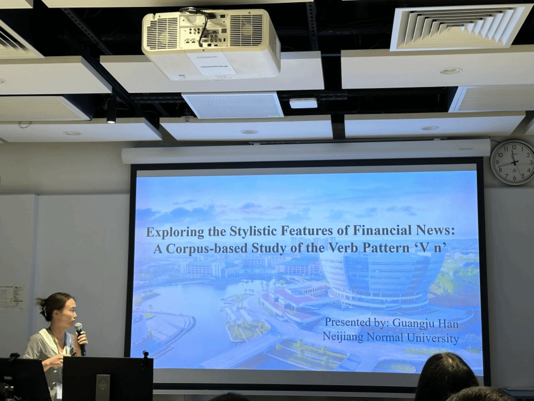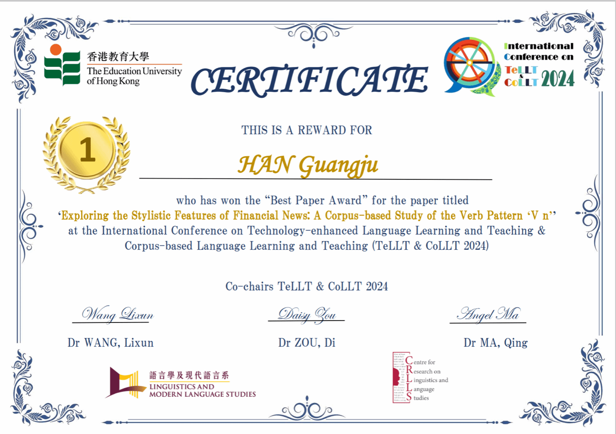 韩光菊老师主题发言题目为Exploring the stylistic features of financial news: A corpus-based study of the verb pattern ‘V n’。该学术论文使用语料库的研究方法,深入分析了财经新闻中动词形式V n的语言特征,并据此探讨其所反映的财经新闻的写作特征,为语言学习和财经新闻的写作和教学提供了新的视角和方法。该论文得到了与会者的广泛关注和认可,并最终荣获会议最佳论文奖。