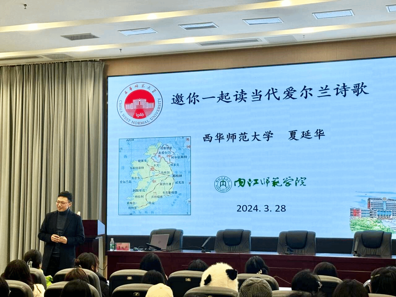 为进一步促进公司学科和科研建设,提升员工英语文学素养,拓宽知识视野,培养员工对诗歌文学作品的兴趣和鉴赏能力,公司特邀西华师范大学教授、博士、公共外语公司经理夏延华于12月6日在会议中心小报告厅举行题为《邀你一起读爱尔兰诗歌》的学术讲座。公司教师及员工代表聆听了本次讲座。