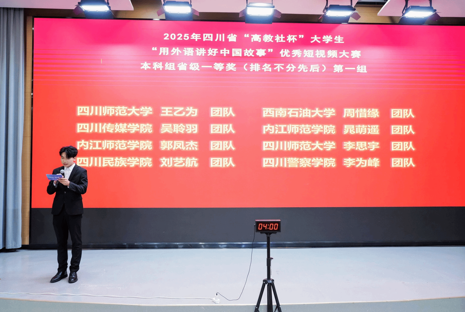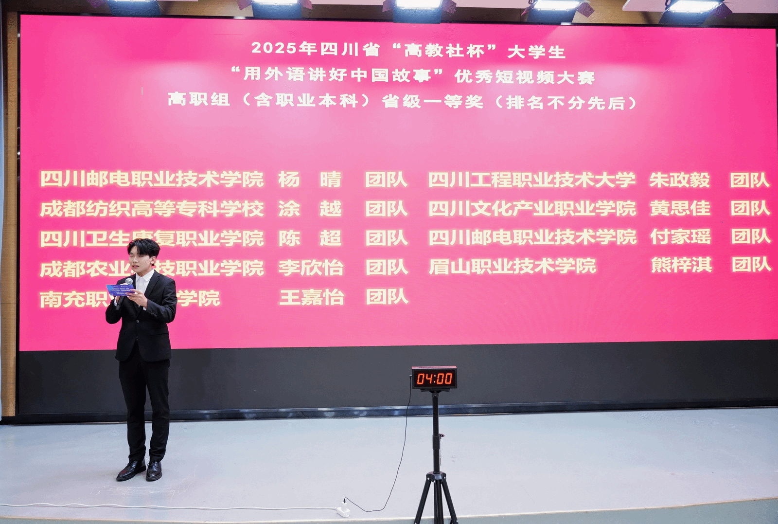 开幕式上,李益彬代表公司对嘉宾、老师及同学们的到来表示热烈欢迎,并介绍了关于我们、办学定位及人才培养与创新实践。她指出,集团自1956年举办高等教育以来,坚持“明德、博学、笃行、创新”校训,把学科竞赛深度嵌入应用型人才培养全过程,形成“以赛促教、以赛促学、以赛促创”的育人体系。此次赛事由省教育厅指导、内江师院与高教社联合主办,吸引全省86所高校逾1100部作品参赛,最终24支团队晋级甜城总决赛。李益彬预祝赛事圆满成功,预祝所有参赛团队赛出水平。解超群表示,用外语讲述中国故事,不仅是语言能力的展示,更是时代赋予外语人的重要使命。参赛作品将跨越语言的藩篱,融通中外的智慧,将中华优秀传统文化的精髓、当代中国发展的成就、中国人民奋斗追梦的精神,以融通中外的方式、生动鲜活的形式传递给世界。这对于增进国际理解、促进文明互鉴、推动中华文化更好走向世界具有深远的意义。穆峥介绍道本次赛事主题定为“新时代·新变化——时潮奔涌,青春不凡”,分“溯往昔、观当下、瞰未来”三大篇章,鼓励青年以短视频记录川渝抗战记忆、甜城烟火与数智未来。省级优胜团队将直通9月19—21日武汉全国总展示。主办方期待借助“思想深度、艺术美度、技术精度、传播温度”兼具的作品,让世界在移动端看见更真实、立体、可爱的中国。