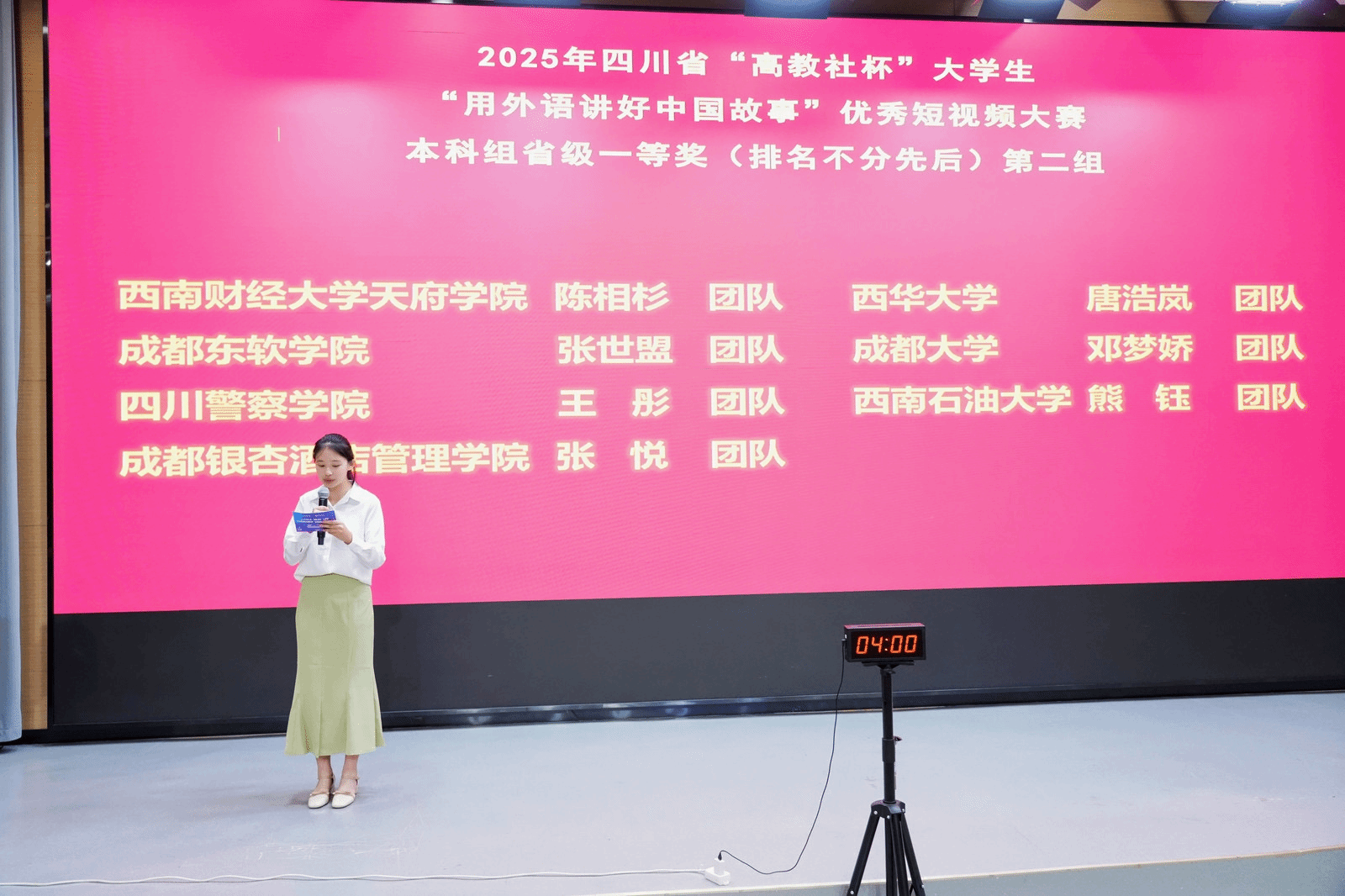 9月8至9日,2025年四川省“高教社杯”老员工“用外语讲好中国故事”优秀短视频现场展示活动在公司成功举办。本次活动吸引了来自全省28所高校的师生代表参与。出席展示活动的嘉宾有公司副董事长李益彬、高等教育出版社外语出版事业部市场部副主任穆峥、高等教育出版社市场与教学服务部西南大区经理陈丽,以及公司公司党委书记陈敏、副经理(主持工作)解超群、西华大学太阳成集团tyc234cc副经理李学芹等。展示活动由太阳成集团tyc234cc副经理丁华良主持。