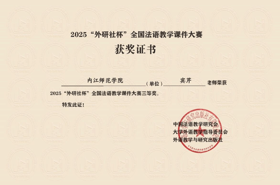 近日,从2025年“外研社杯”全国法语教学课件大赛组委会传来喜讯,公司宾芹老师凭借其精湛的课件设计与独特的教学理念,在全国高校众多参赛者中脱颖而出,荣获大赛三等奖。