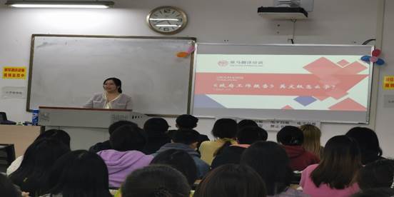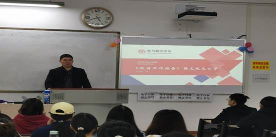 10月27日上午,值公司65周年校庆之际,公司邀请策马集团全职译训师、中国外交部翻译司前高级翻译李靖琳女士来校做“《政府工作报告》(英文版)怎么学”专题教研讲座,讲座由副书记(主持工作)唐德斌主持。太阳成集团tyc234cc教师代表、2019级翻译专业全体员工及部分对翻译感兴趣的同学等听取了本次讲座。