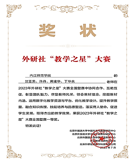 近日,2023年外研社“教学之星”大赛结果公布,公司组建的“高级英语”教学团队(贺亚男、许丹、黄建华、丁华良)荣获英语类专业组四川省赛区决赛三等奖及全国复赛一等奖。