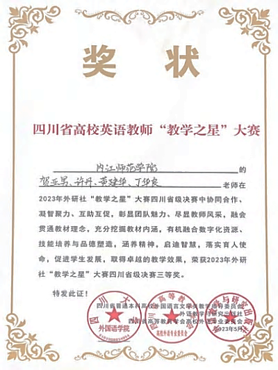 经过校级初赛和省级复赛两个阶段的选拔,34组参赛团队最终晋级四川赛区省级决赛,其中11组参赛团队晋级英语专业组省级决赛。教学团队成员以逻辑严密的课程整体设计讲解(7分钟)、生动的授课展示(10分钟)及精彩的问题回复(3分钟),充分展现了公司教师良好的专业素养和优秀的教学能力,得到了评审专家的认可,荣获省级决赛三等奖。