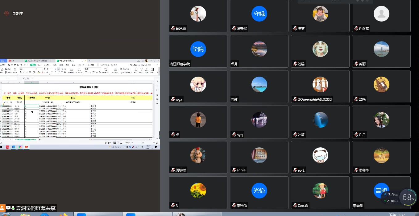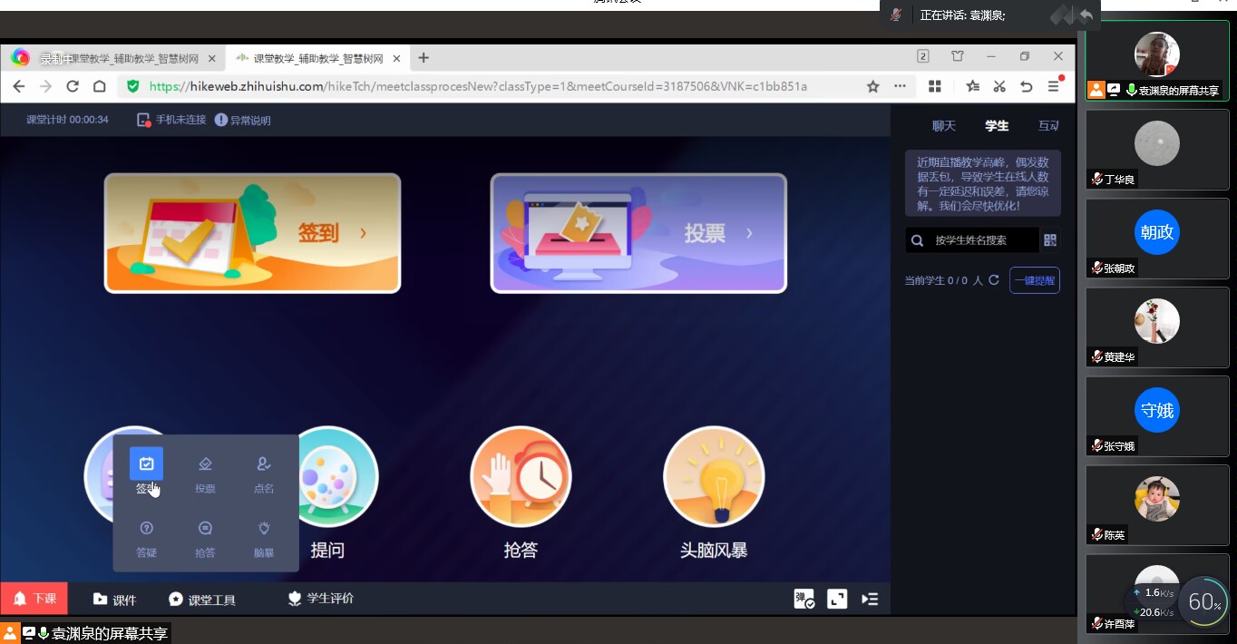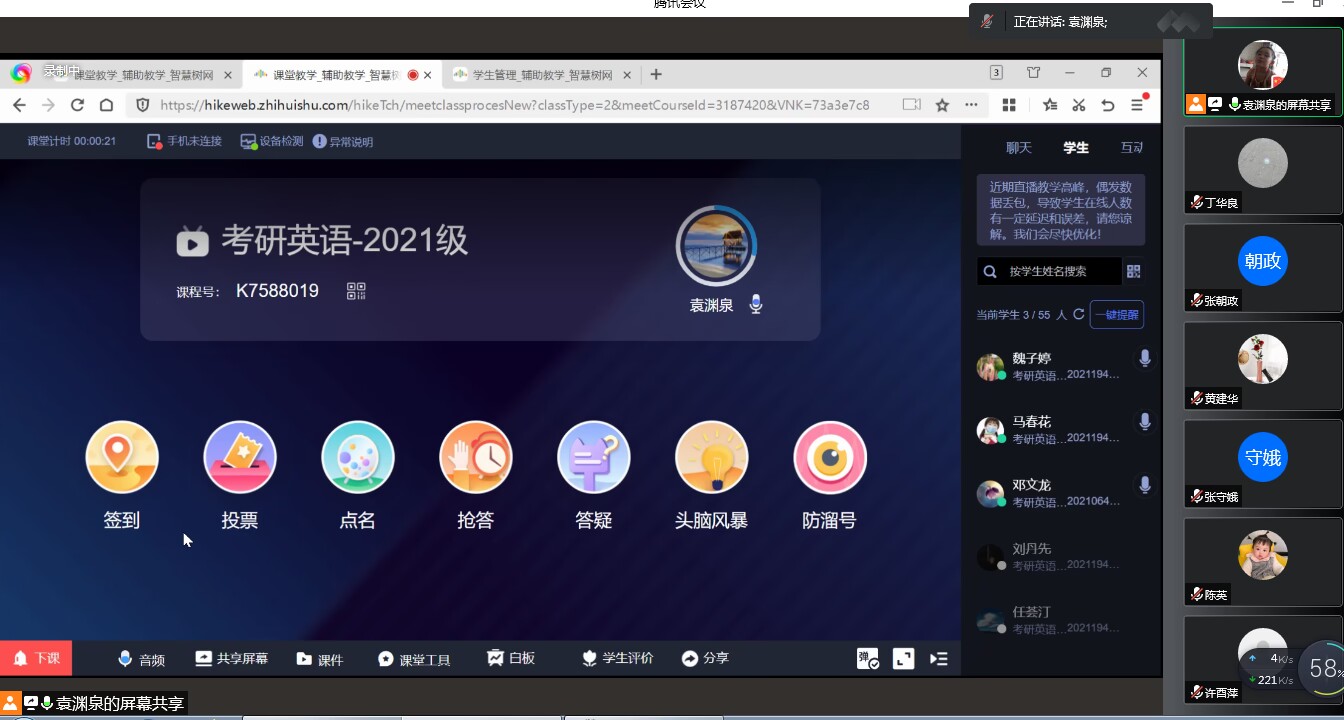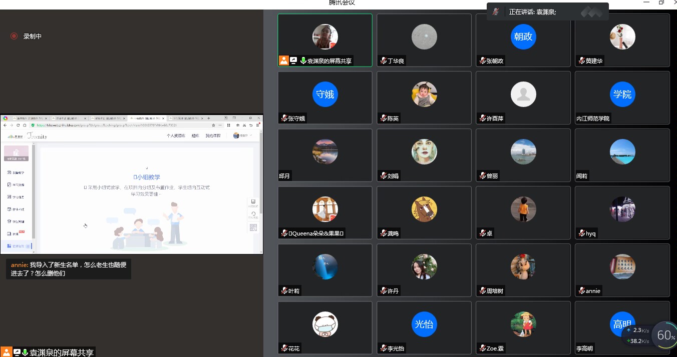 袁渊泉老师的讲解结束后,老师们表示基本上清楚了该如何使用智慧树平台进行线上直播授课,但也有老师提出授课中如果智慧树平台网络卡顿该如何解决。老师们还提出了许多其他问题,比如如何进行分屏,如何利用智慧树进行听力课教学等。针对这些问题,参会的老师们展开了热烈讨论,大家各抒己见,提出了很多意见和建议。