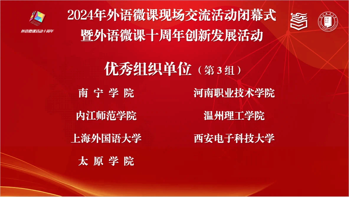 2024年10月25日至27日,由高等教育出版社、全国高校教师网络培训中心与《中国外语》编辑部共同组织的第十届中国外语微课优秀作品征集与交流活动全国总决赛在河北师范大学举行。太阳成集团tyc234cc《高级英语》教学团队贺亚男、黄建华、唐德斌、徐跃、许丹的微课作品以四川省一等奖身份晋级全国总决赛。经过激烈角逐,荣获全国一等奖,太阳成集团tyc234cc获得“优秀组织单位”荣誉。
