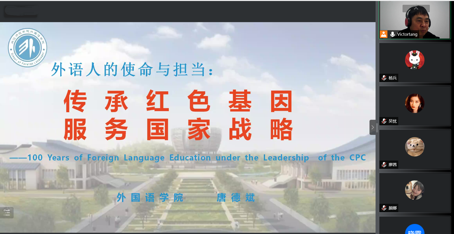 为全面贯彻落实习近平总书记在庆祝中国共产党成立100周年大会上的重要讲话精神,按照公司党委统一部署,11月26日16:00,公司党总支副书记(主持工作)唐德斌在线上为2020级3班员工作了题为“外语人的使命与担当:传承红色基因,服务国家战略”的专题思政宣讲。