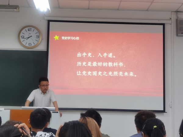 2021年6月8日,在第五教学楼,副经理徐跃为联系班级2020级1班带来了党史学习讲座,本次讲座旨在激励同学们从百年党史中汲取智慧和力量,努力做到德智体美劳全面发展,成为社会主义事业建设者和接班人。