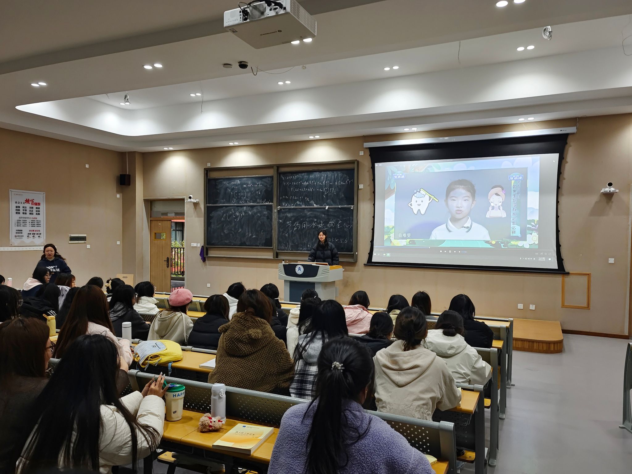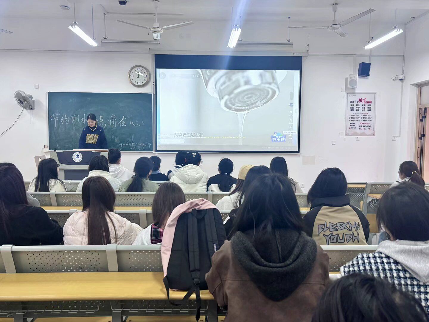 班会伊始,各班团支书通过图文和视频资料,向同学们展示了全球水资源现状、缺水带来的严峻挑战以及日常生活中的节水小窍门。同学们认真聆听,并围绕“如何在日常生活中节约用水?”展开热烈讨论,不少同学分享了自己的节水经验,如用洗菜水浇花、及时关闭水龙头等。