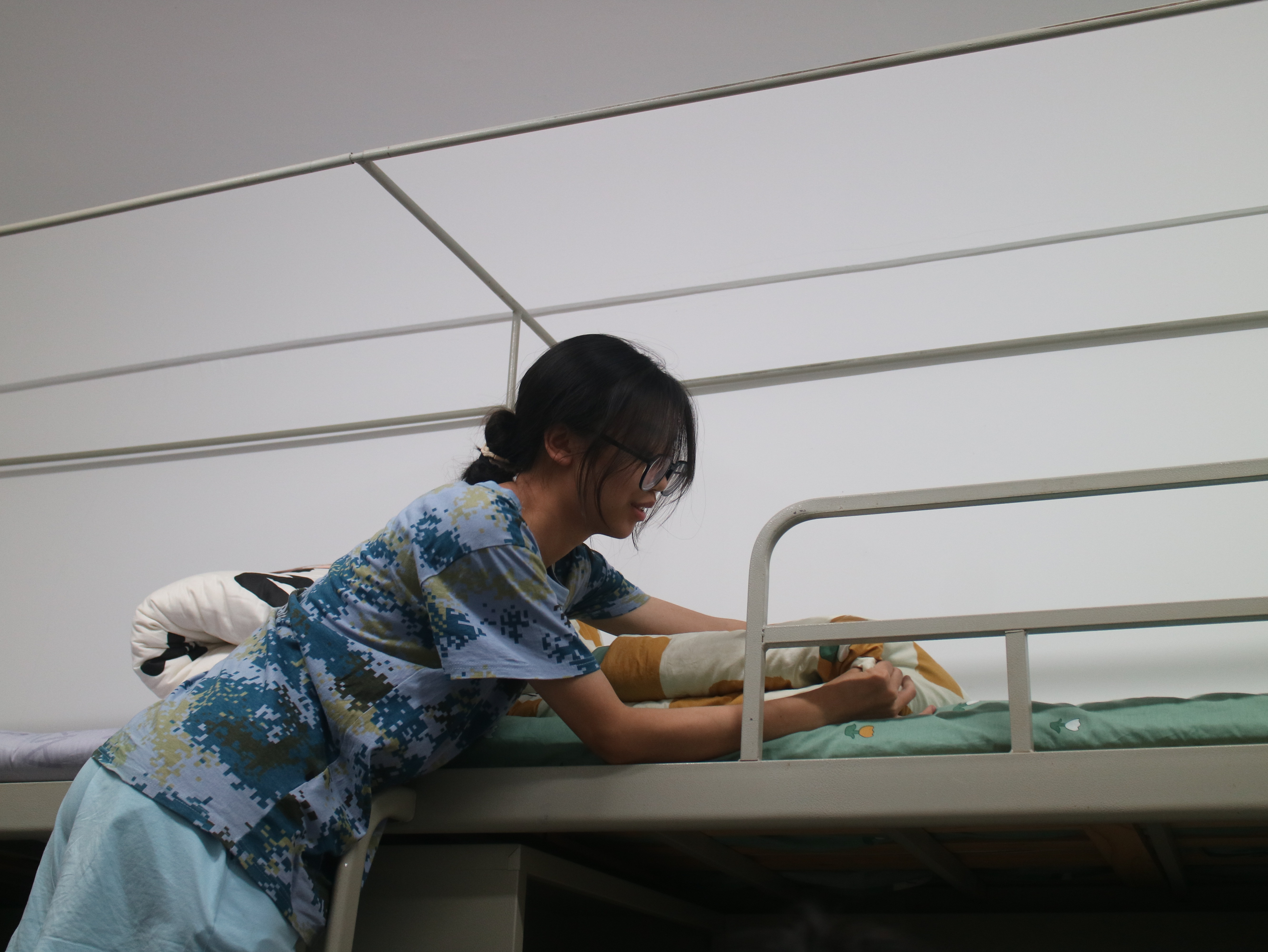 志愿者们逐一对新生宿舍卫生进行检查并指出问题。根据军训内务要求向新生分享内务整理技巧,指导新生如何正确摆放被子、枕头、洗漱用品,同时对新生提出的内务细节问题进行耐心解答。经过整理,新生内务整洁度得到提高,被子方正、窗户明亮、书柜整洁。最后志愿者对新生宿舍卫生进行检查后才放心离开。