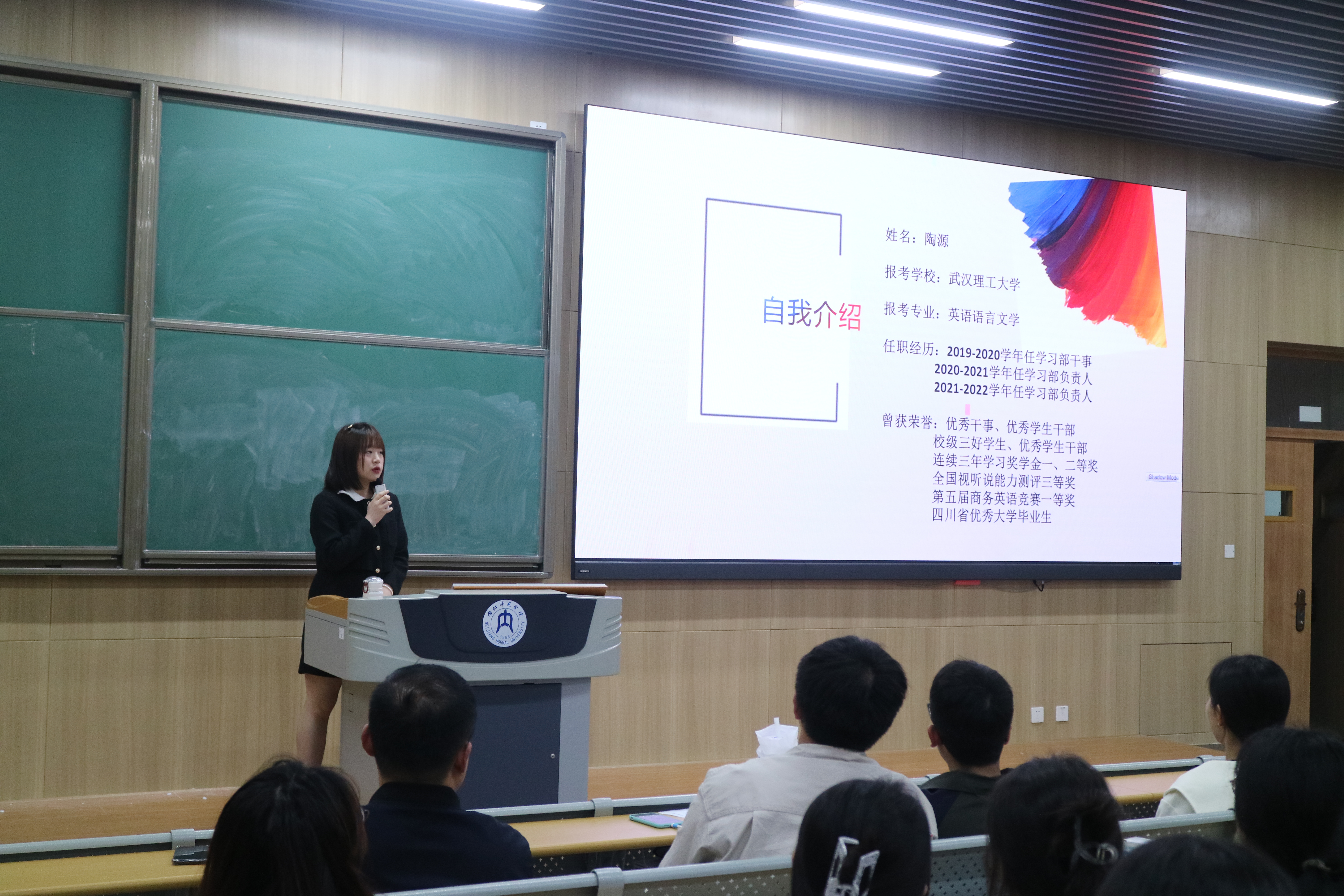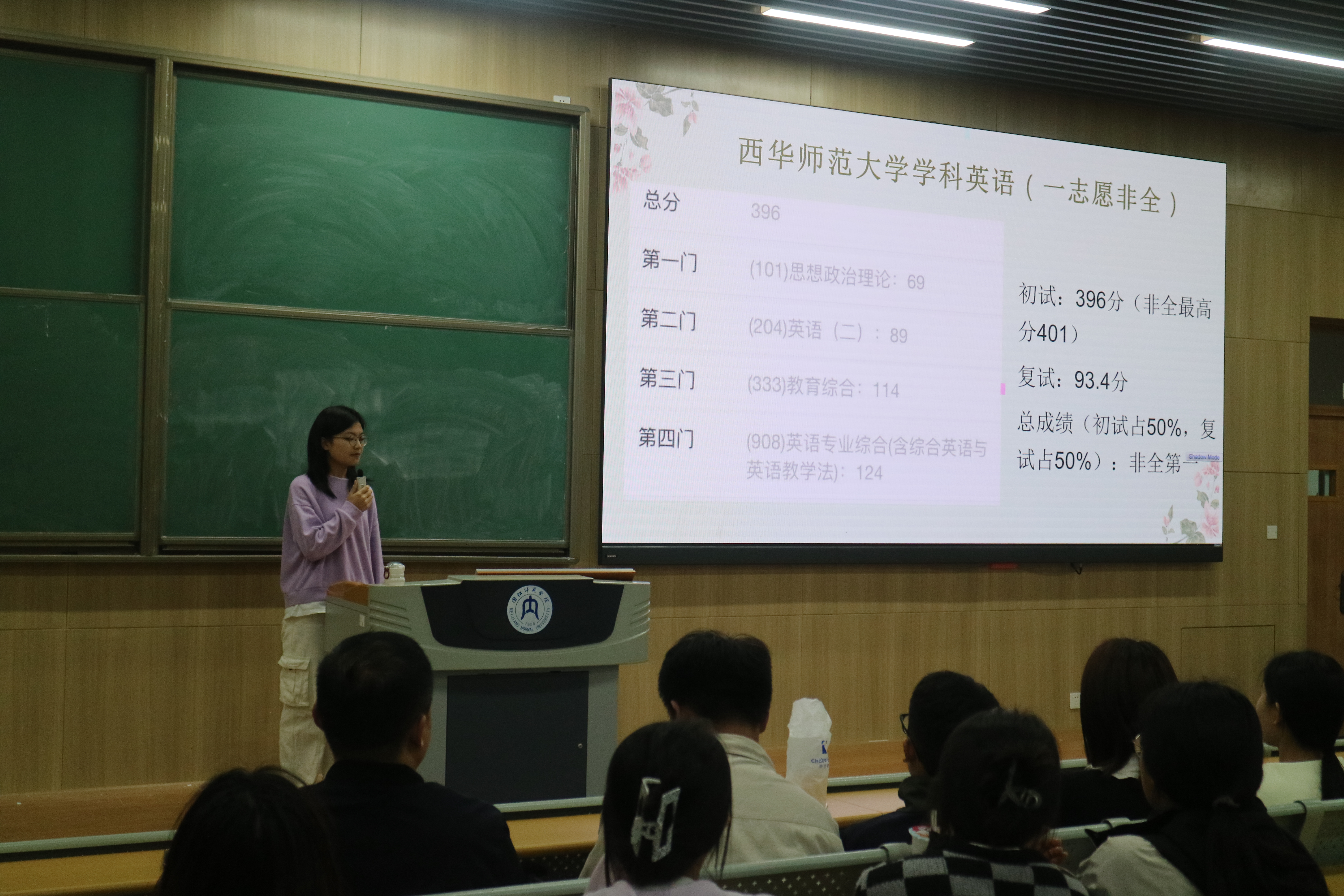 考取四川外国语大学的刘舸首先从考研动力、考研择校、跨考学习、备考心态等方面强调了考研备考注意事项,他指出,要选择自己真正热爱的专业,这也是备考最为持久的学习动力,同时要探索出属于自己的学习节奏,并严格按照学习计划要求自己。李春香从公费师范生的角度分享了非全日制研究生的备考,分享了英语教学法、教育综合333等具体考试科目的复习方法,不仅从理论层面为同学们指明了复习方向,也从方法层面为同学们提供了具体可行的策略;张金辉重点介绍了他选择专业、选择院校的经验,在复习备考上,他强调要有详细的学习规划并保质保量地完成,在扎实的基础上收获学习的快乐;陶源提出考研要保证健康的生活学习作息,以饱满的精神状态复习备考,同时,也要学会调整自己的情绪,在遇到突发情况时冷静处理,调整状态,投入新科目的学习,最后通过自己的努力成功上岸;王思涵重点介绍了自己的调剂经验,鼓励在校的学弟学妹们专注专业能力提升,争取在同样的时间内获取更多的调剂信息。