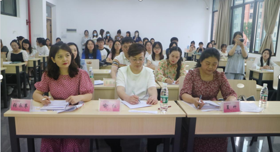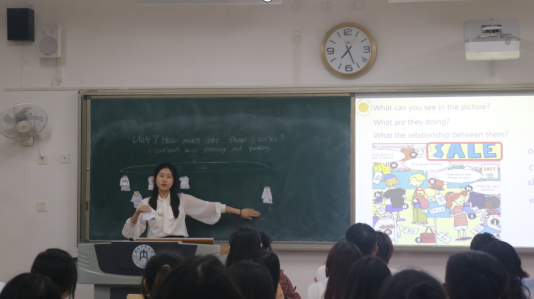 比赛伊始,孙倩介绍了评委老师,并对相关比赛规则和评分标准进行了简单的介绍。随后,参赛选手根据抽签顺序依次进行模拟授课与答辩。评委老师们从多媒体制作、书写技能,片段教学等多个方面,综合考察了员工的师范生技能。比赛现场高潮不断,参赛选手们以流利的语音语调、完善的教学设计和颇具创意的板书,为现场观众呈现了丰富生动的课堂教学。