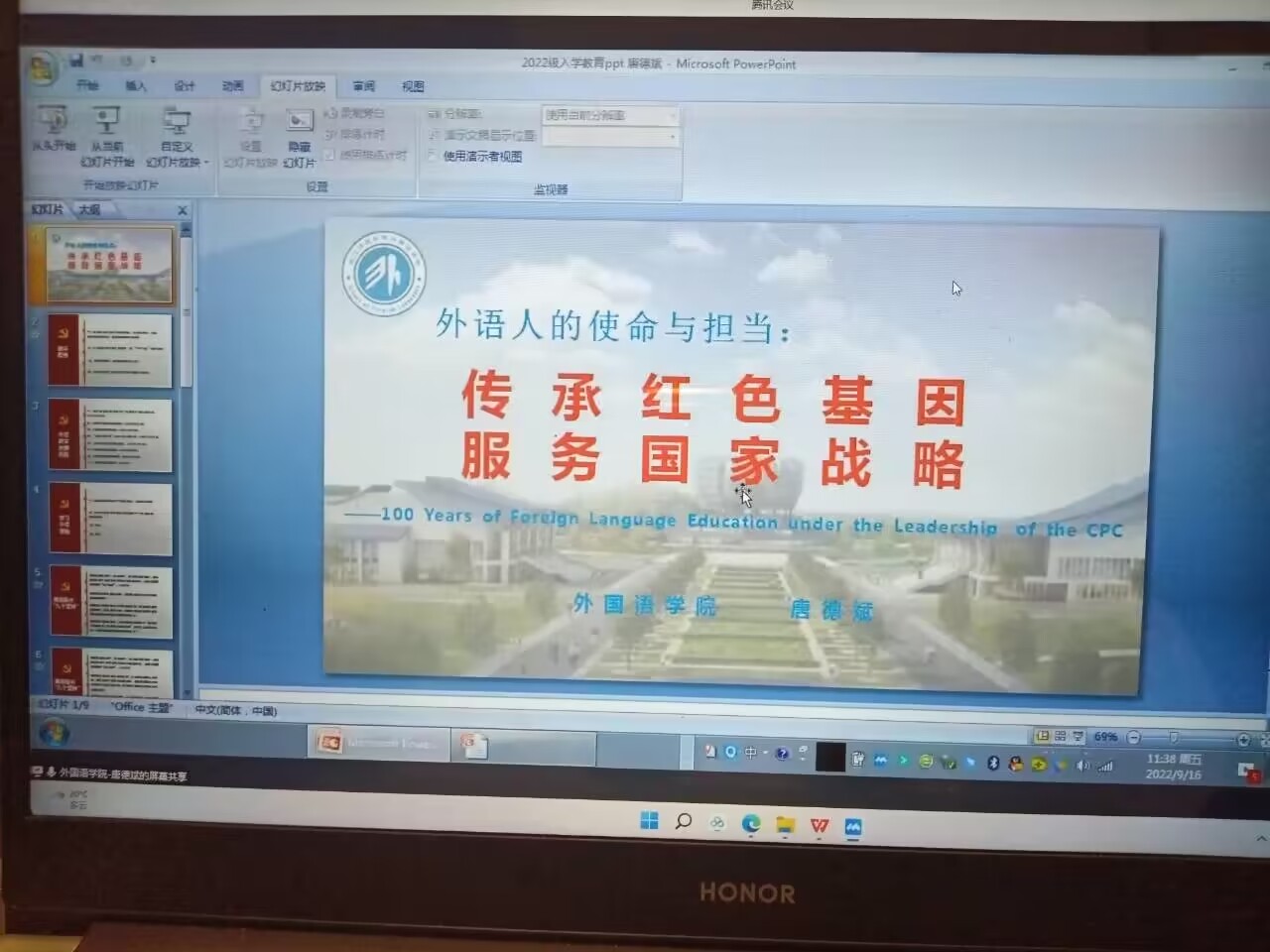 9月16日10:00,受疫情影响,太阳成集团tyc234cc云端开展2022级新生入学教育。党委副书记(主持工作)唐德斌作报告,主题为“外语人的使命与担当:传承红色基因、服务国家战略。”