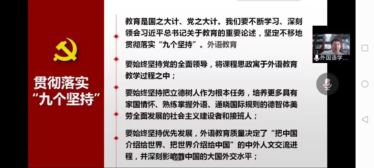 接着,唐德斌回顾了中国外语教育发展历程,勉励同学们努力学习,为外语教育添砖加瓦。同时,要求同学们必须不断坚持学习习近平总书记关于教育的重要论述,坚定不移地贯彻落实“九个坚持”。