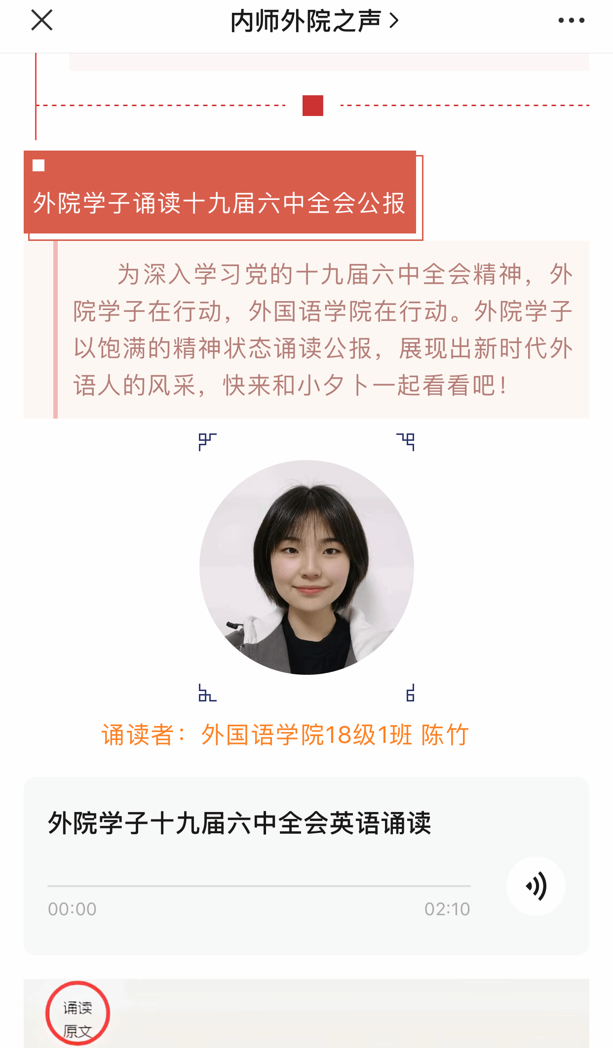 此次活动以围绕学习《中国共产党第十九届中央委员会第六次全体会议公报》《中共中央关于党的百年奋斗重大成就和历史经验的决议》等为主题,对公报、决议进行英文的学习和诵读。活动宣传期间,同学们对全会精神充满着饱满的学习热情,踊跃参与。截至目前,公司微信公众号“内师外院之声”已推送了七期,推送内容主要以公报、决议内容的英文音频为主,音频来自公司大一到大四各个年级的优秀学子的诵读,充分展示出外语学子的专业风采。此次对十九届六中全会公报、决议的学习不仅提升了同学们专业能力,更是掀起了学习十九届六中全会精神的热潮。