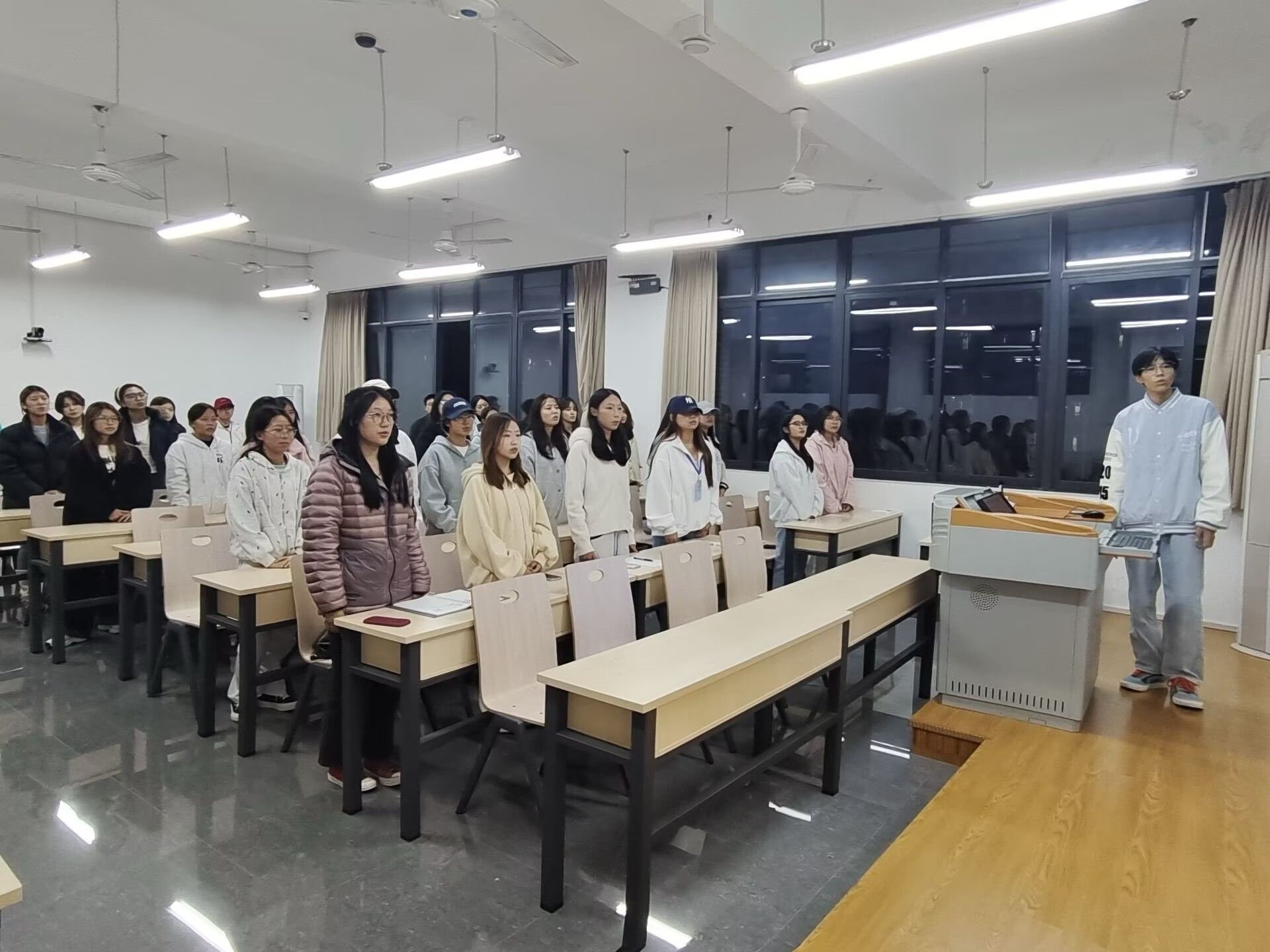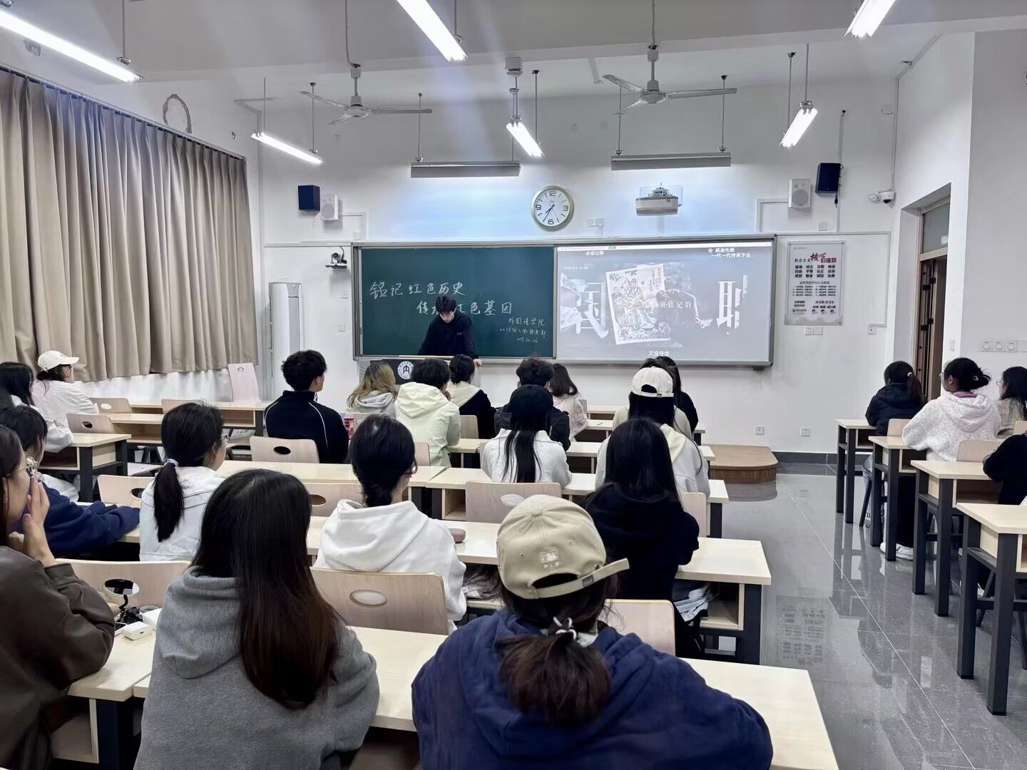 活动伊始,各班团支书对团日活动的主题意义、流程安排进行了简要介绍。随后,各团支部以饱满的热情齐唱了团歌《光荣啊!共青团》。活动期间,部分团支部组织观看了《南京照相馆》、《觉醒年代》等红色影片片段;部分团支部朗读了革命烈士诗抄、家书或领袖著作节选,通过深入学习,感受先辈们为理想信仰不惜牺牲一切的崇高精神。在讨论交流环节,同学们踊跃发言,分享此次主题团日活动学习的心得与感悟,他们纷纷表示,要将对革命先烈的缅怀与敬仰,转化为刻苦学习、提升本领的实际行动。最后,团支书对本次主题团日活动做了总结发言,鼓励同学们以红色历史学习为纽带,推动青年在回望历史中坚定理想信念,在传承基因中明确使命担当。