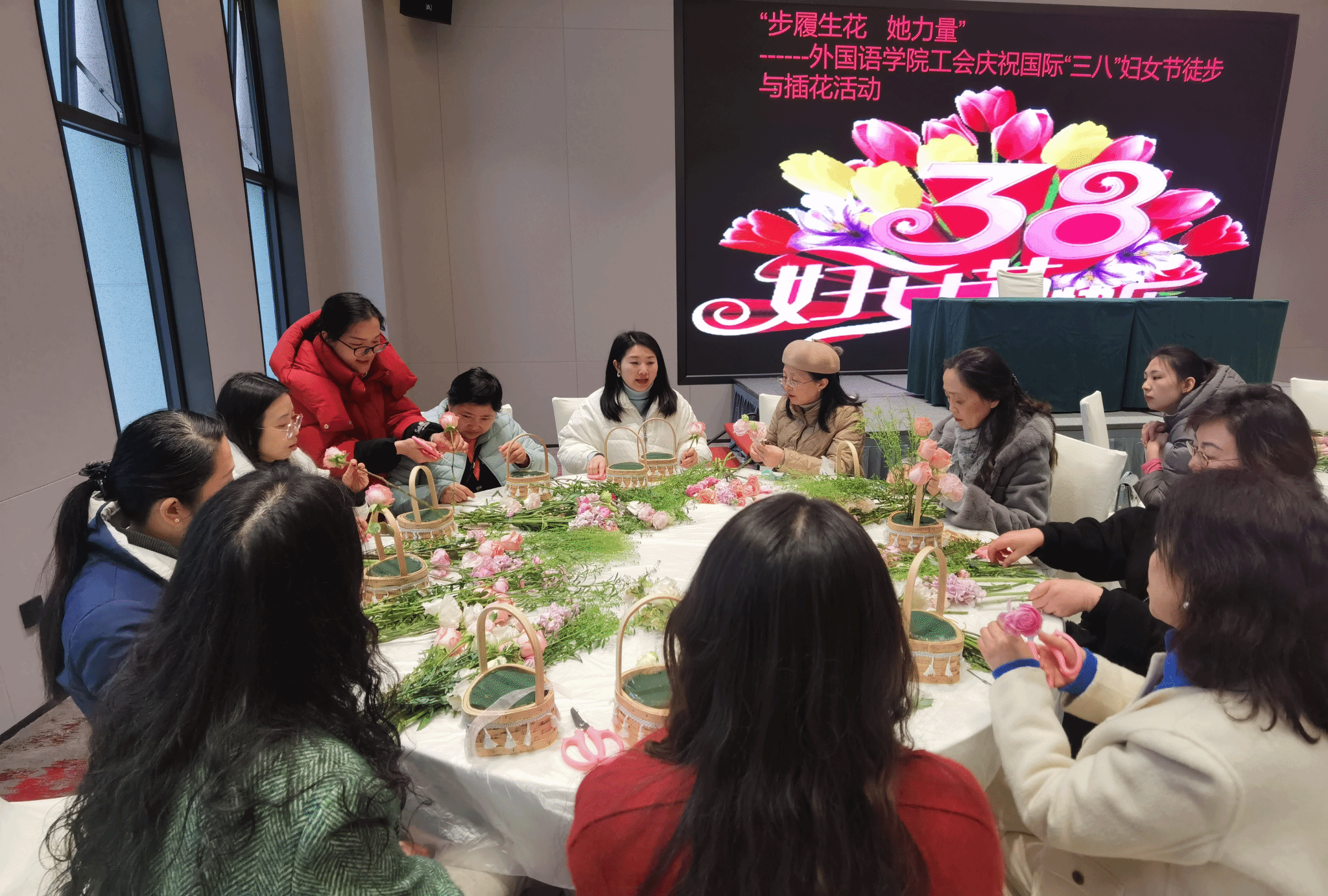 徒步结束后,随即展开插花活动。专业花艺师从选花技巧、色彩搭配到创意造型进行细致讲解。女教职工们巧妙运用玫瑰、康乃馨、洋桔梗、紫罗兰等花材,将东方插花的雅致与西方花艺的灵动相融合,创作出独具匠心的作品。
