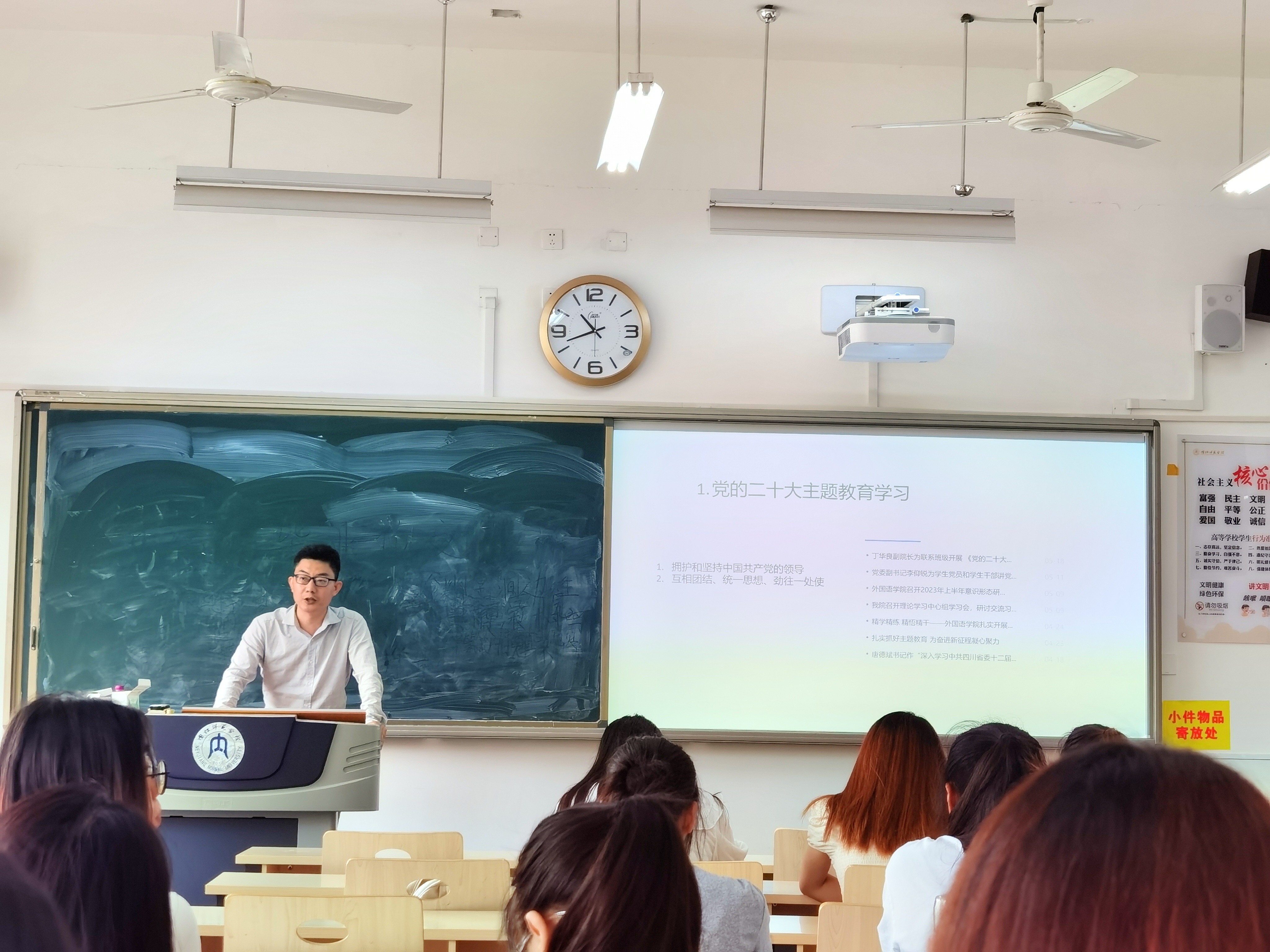 随后,解超群结合联系班级的专业特点,为同学们简要介绍了英语专业的培养目标,结合同学们本学期的实际学习情况,帮助同学们厘清了专业学习时间紧任务重背后的逻辑,希望同学们能够充分安排好自己的学习时间,提升专业能力。