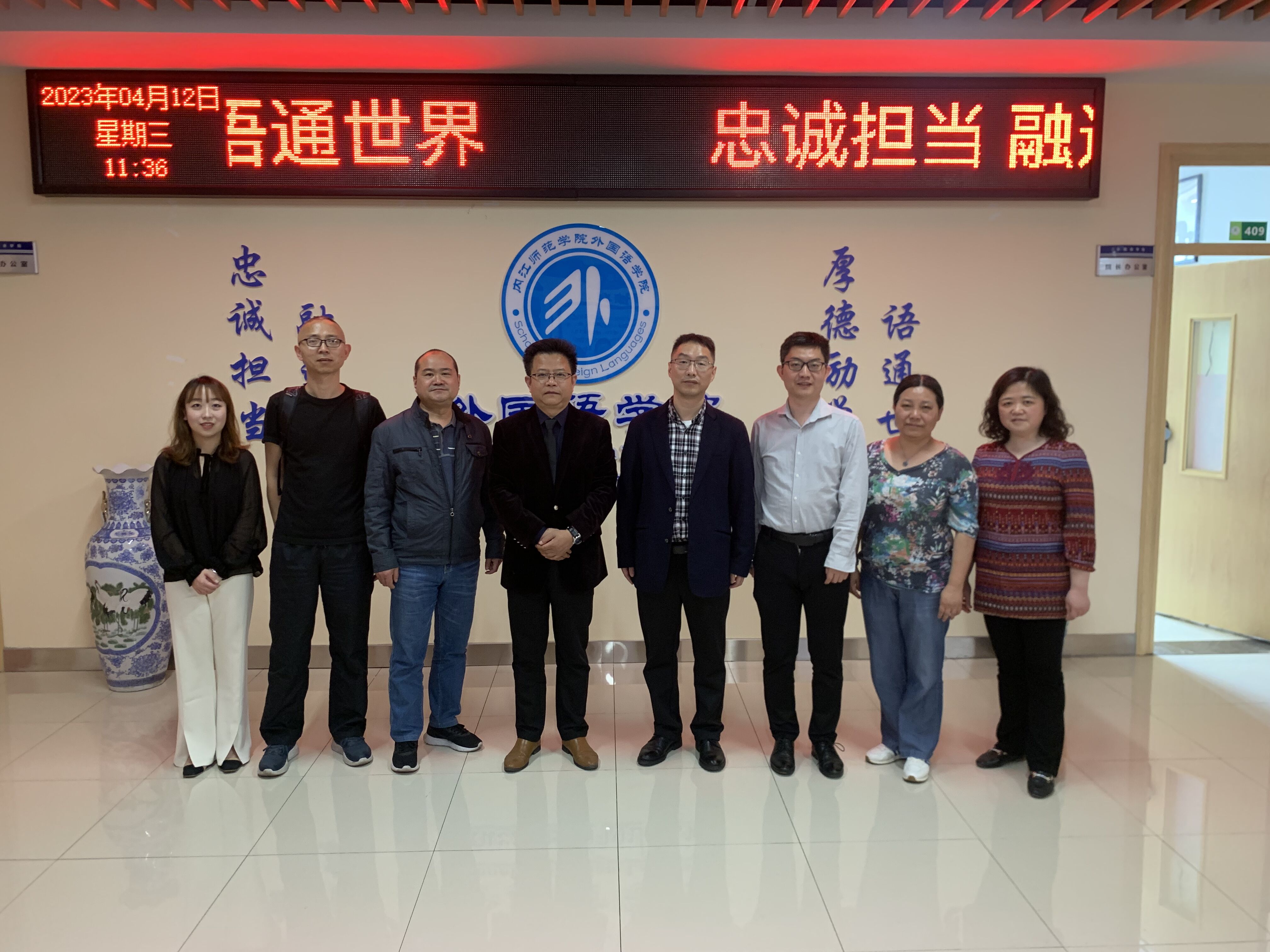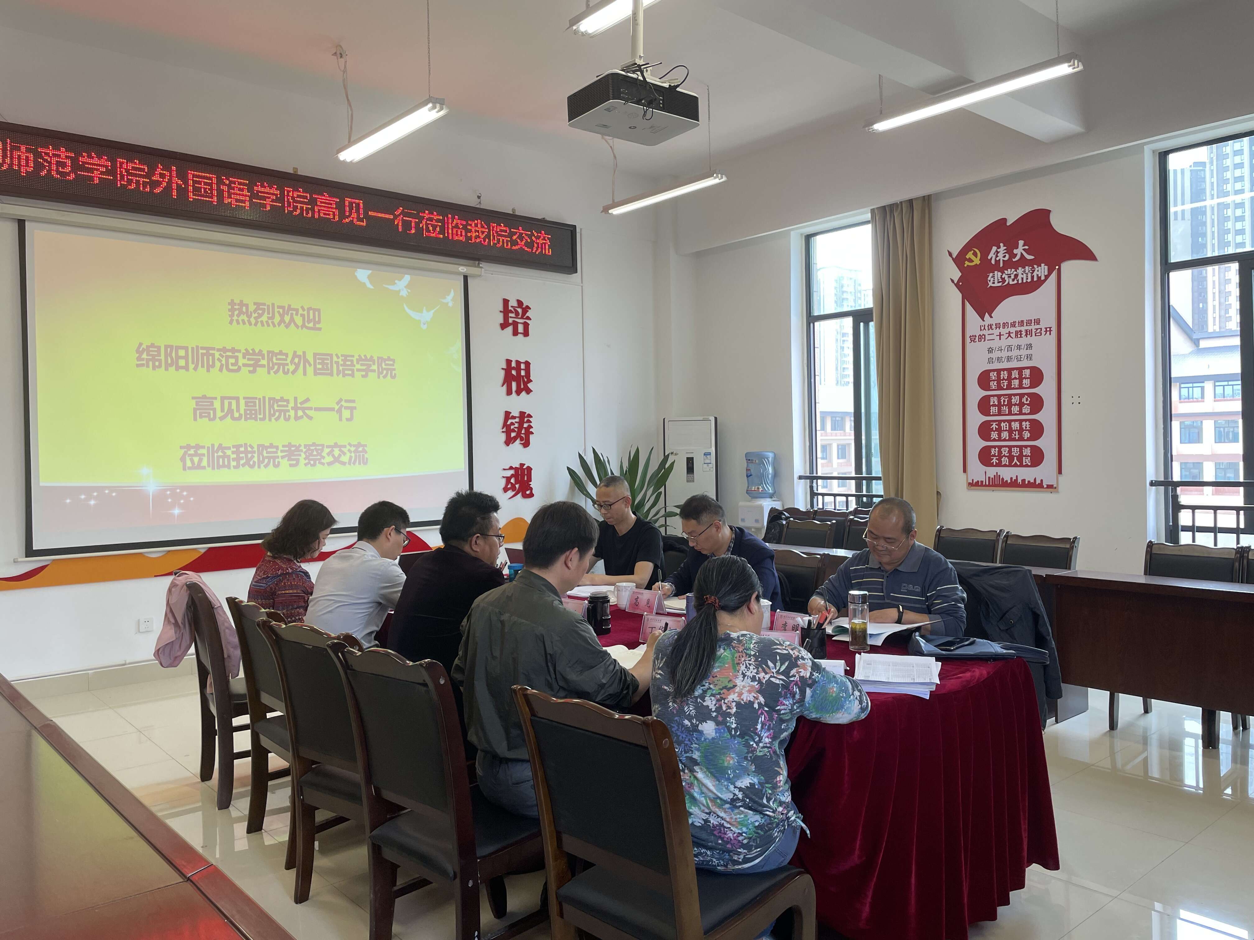 2023年4月12日,绵阳师范公司太阳成集团tyc234cc副经理高见、教务办主任李明峻和英语专业负责人高建国一行三人莅临公司,就英语专业人才培养方案、团队建设、专业建设、课程建设等问题进行交流。太阳成集团tyc234cc经理徐跃、副经理解超群、副经理丁华良、教科办主任郭平、英语专业教研室主任孙倩和大学英语教研室主任袁渊泉参加交流活动。