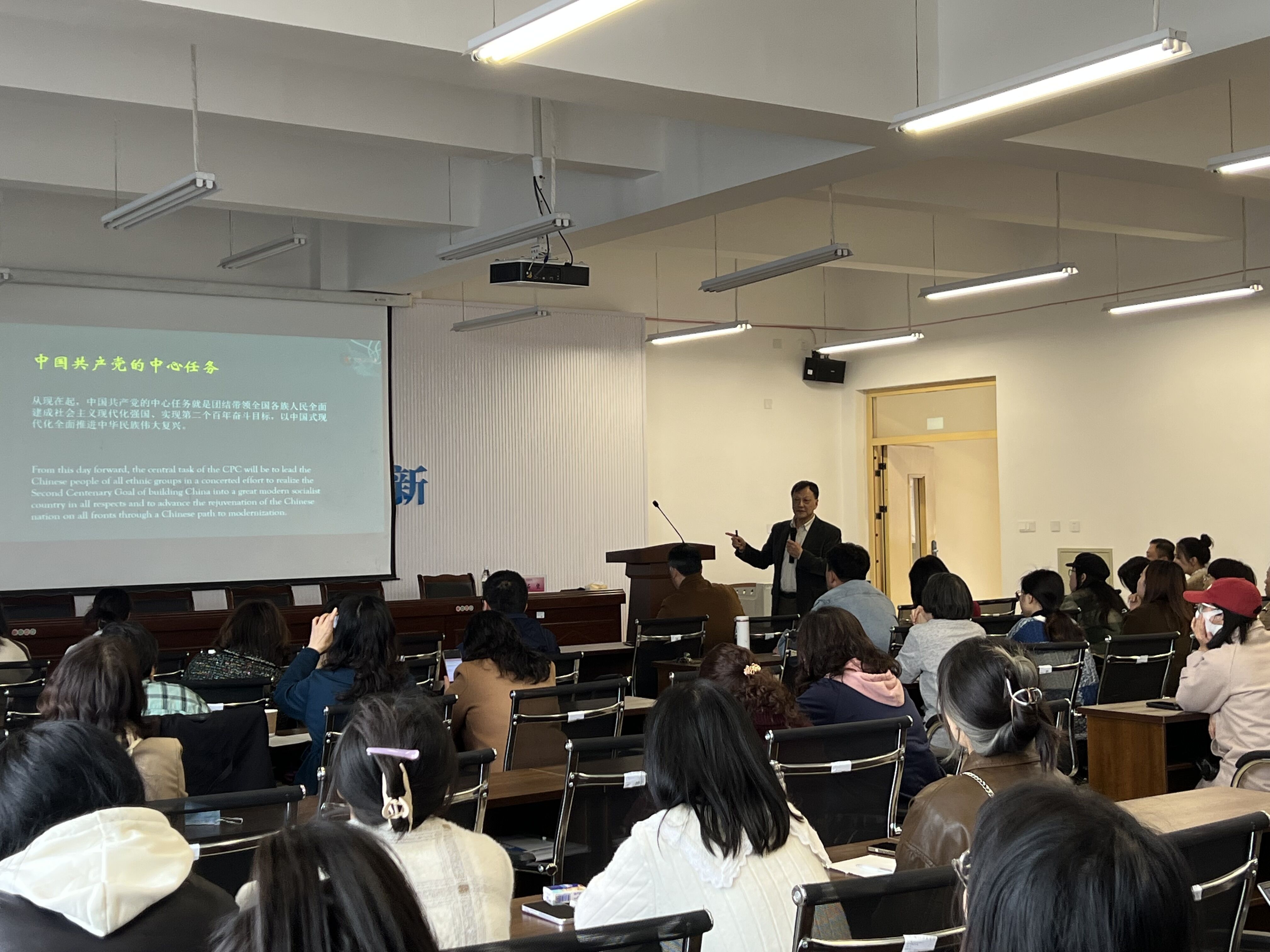 在讲座中,石坚教授用亲身经历来阐述育人理念,他强调在外语教育中,课程思政育人要将课程思政与学科优势结合起来,将立德树人与国家意识结合起来。结合“一带一路”倡议,他指出外语文学教育具有独特优势,可深挖课程内涵,引导员工坚定文化自信。他论述了课程思政的学科统筹,指出教学中应“因材施教”,以心、情、智、意育人。并强调育人出自细节,外语教育应培养员工的“读、写、思、辨(辩)、创”能力,培养有家国情怀的社会主义建设者和接班人,真正做到培根铸魂、启智润心。最后,石教授提出:人文教育的核心在于教师,教师需完成从讲课教师到育人导师的角色转变,实现师生共同进步。
