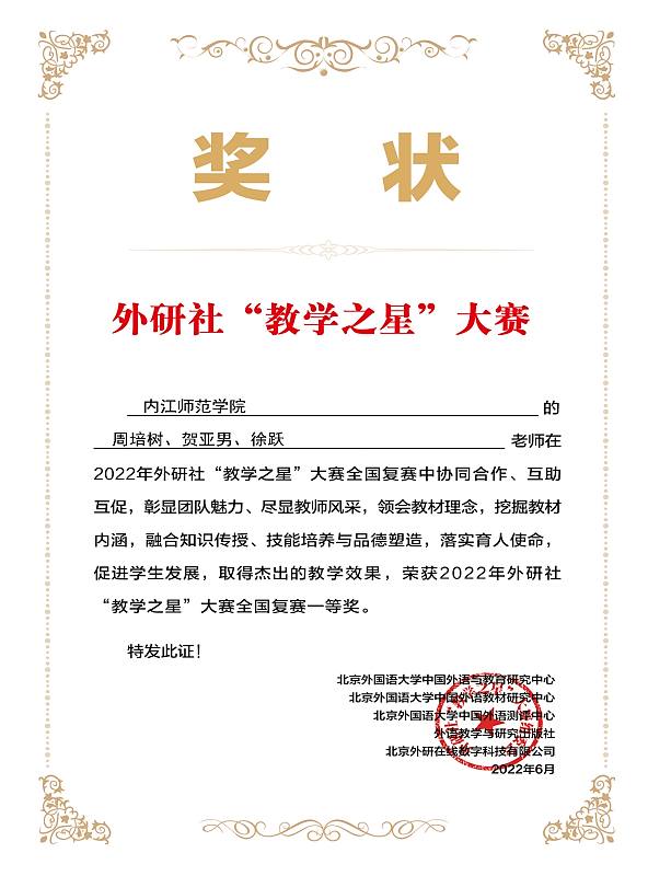 近日,2022年外研社“教学之星”大赛全国复赛结果公布,公司教师周培树、贺亚男、徐跃组成的综合英语教学团队在2022年外研社“教学之星”大赛全国复赛(英语类专业组)中荣获一等奖。
