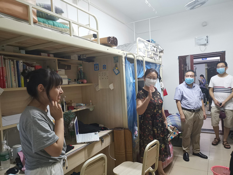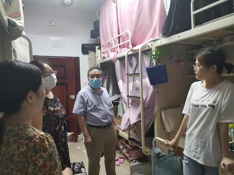 王莉书记在走访员工宿舍过程中,勉励员工珍惜最后的校园时光,为老员工活画上一个圆满的句号。她还叮嘱员工要做好晨午晚体温测量和登记,勤洗手、戴口罩,多通风,出现异常情况第一时间向班主任和辅导员报告。对还未落实工作的同学,她详细询问了未就业的原因,建议同学要认清形势,合理定位,勇担责任,积极就业。