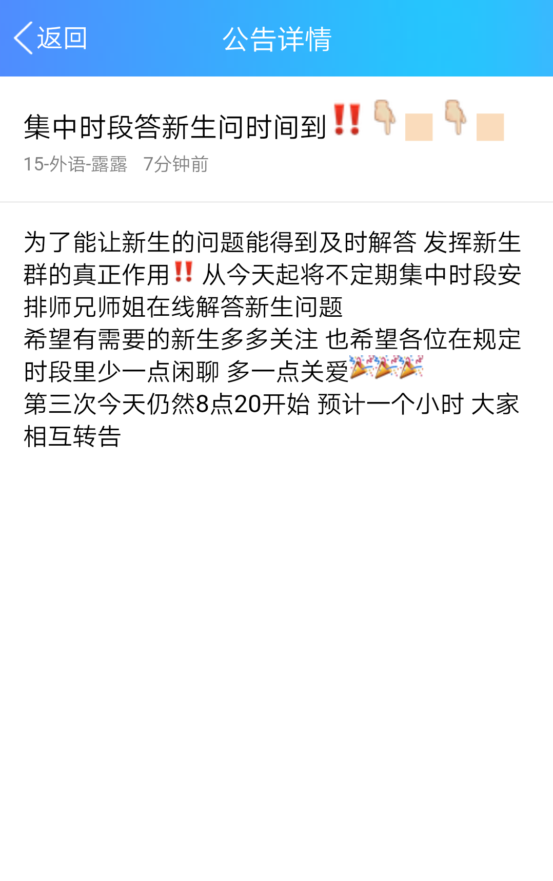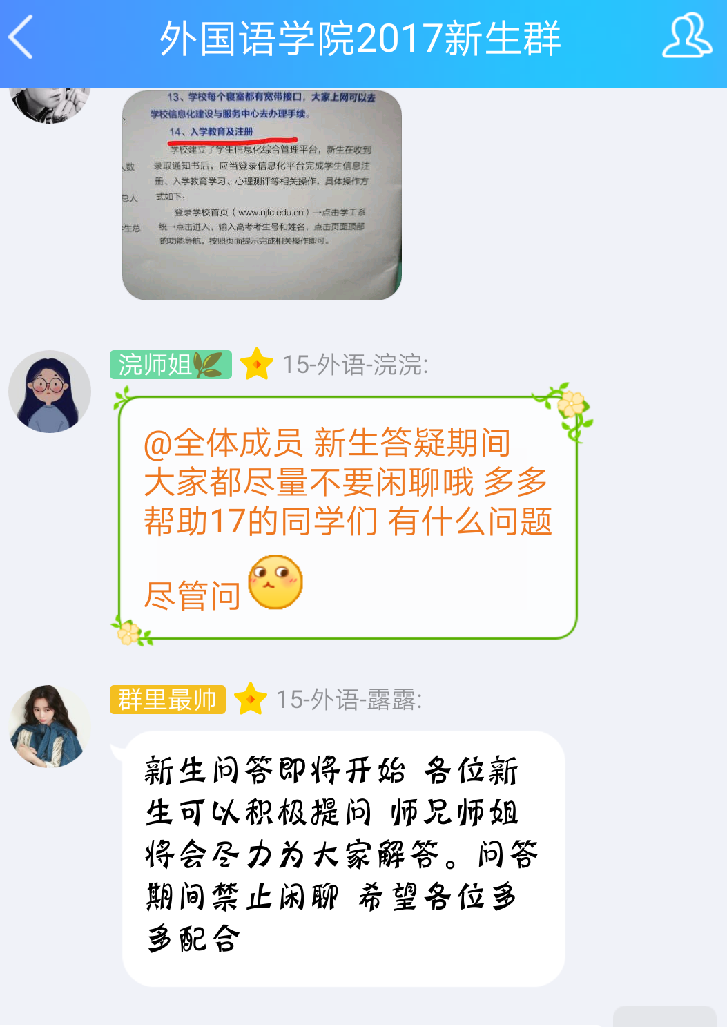 8月6日和7日20:20,分别进行了第一次与第二次的解答。8月9日晚20:20—21:20,第三次解答环节开始,新生们在群内提出自己的疑问,同学们都积极回答问题。为提高回答内容准确度、真实度以及给新生最好的答复,同学们都做到了不确定的问题不乱答;同样的问题不重复回答;不漏掉每个新生所提出的任何问题;回答跟新生第一年切实相关的问题;尽量避免了自己的主观感受,客观回答,积极引导新生;新生问什么回答什么,没问到的问题不主动抛出来。