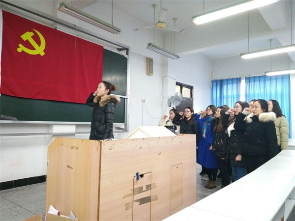 首先是何晓霞等38名新发展党员面对鲜艳的党旗,举起右手庄严宣誓。