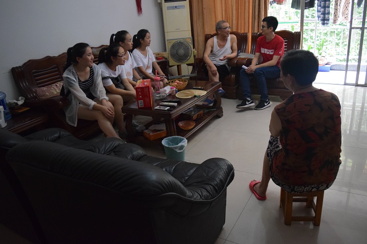 志愿者怀着紧张又期待的心情走访了第一位老人——82岁高龄的李远芳同志,她为我们讲述了年轻时候的一些故事。在接近一个小时的谈话中,我们了解到她的老伴曾参加过抗美援朝战争,也感受到了改革开放以来国家的发展历程。同时,志愿者们也将自己的情况以及家乡的建设情况跟老人们一同分享,整个家中萦绕着爱的暖流,场面温馨感人,老人们的脸上全都洋溢着幸福的笑容。