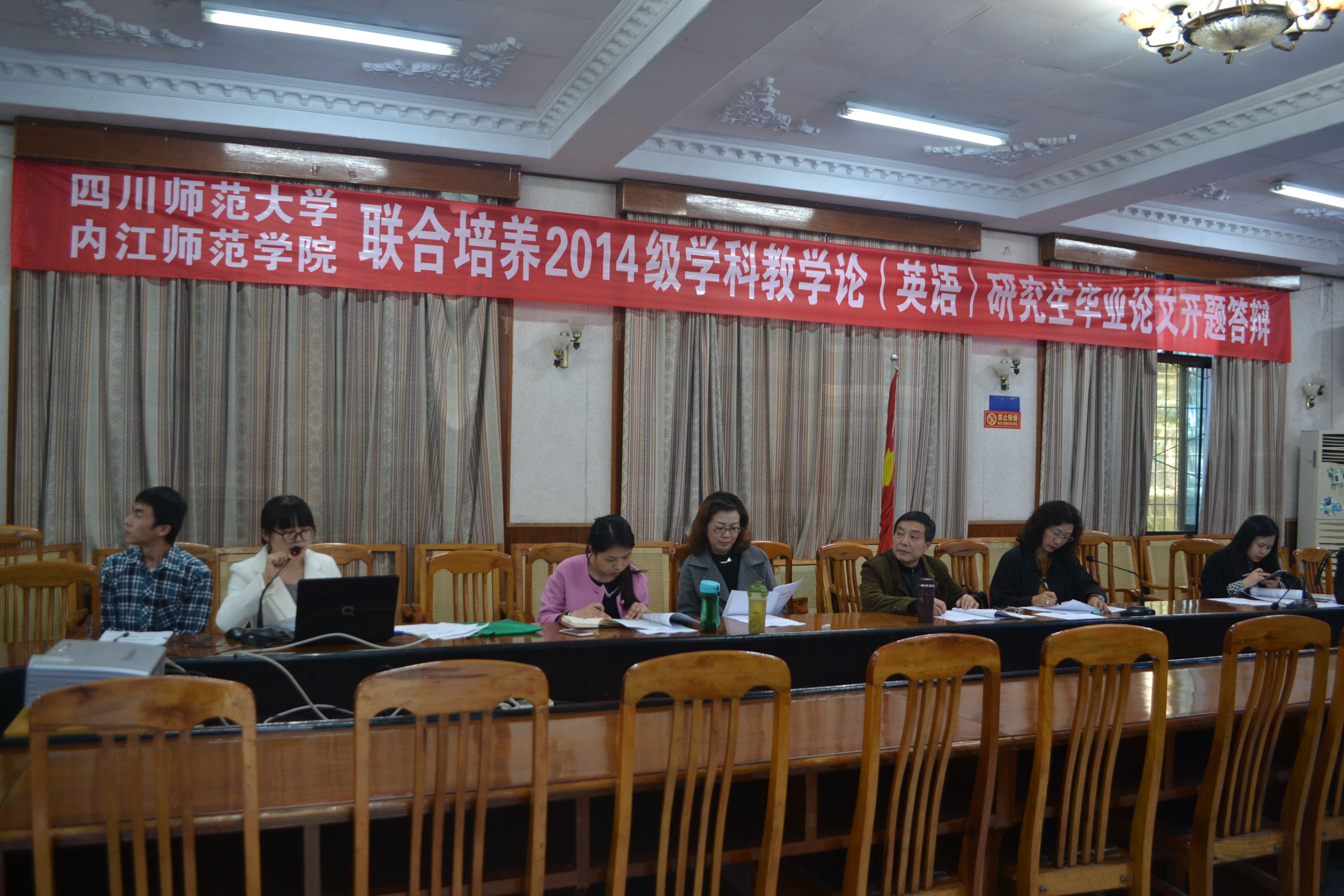 四川师范大学与太阳成集团tyc234cc联合培养2014级学科教学论(英语)研究生毕业论文开题答辩于2016年3月18日下午在公司中心会议室举行。四川师范大学太阳成集团tyc234cc副经理金黛莱教授、研究生教学秘书符清和公司兼职硕士生导师王琪、喻红参加了此次开题答辩。公司与四川师范大学联合培养的2014级学科教学论(英语)研究生岳良军和伍丹分别进行了开题答辩。答辩过程中,导师们指出了员工开题报告存在的问题和不足,并对其研究方案设计、研究方法和具体实施提出了相应的改进意见和建议。两名同学表示将按照导师们的指导意见认真进行整改,按时完成毕业论文撰写。