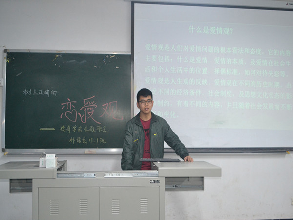 本次班会活动由各班班长主持。首先,各班班长带领同学们一起思考“什么是爱情?什么是正确的恋爱观?” 接着通过一个简短的小视频具体而又形象地阐释了这个问题。随后,充满趣味的测试调动了同学们的积极性,重温电影情节里的经典爱情片段让同学们对爱情有了更深的感触,同学们也讲述了自己对爱情的看法。此次班会活动内容形式丰富多彩,让同学们积极参与到班会之中。最后,各班班长进行了总结陈词并分享了自己的恋爱观。