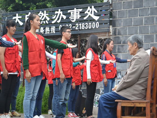 走进敬老院,志愿者们都热情的和爷爷奶奶打招呼,给他们递上水果,和他们唠嗑。志愿者们半蹲着与老人交谈,听老人们讲述他们的故事,也和老人们分享自己的开心事。老人们也感受到了志愿者们的关心与祝福,随后,志愿者们为老人献上了他们精心准备的表演。红歌串烧使老人们想起他们热情澎湃的青春时代,老人们也随之哼唱着那经典的旋律。随后小品《拂晓》勾起了老人对那个时代的伤感记忆,一位爷爷默默地掉下了眼泪。热情的舞蹈《小苹果》让爷爷奶奶们乐得手舞足蹈,《外婆的澎湖湾》唱着志愿者们对爷爷奶奶们的喜爱。最后,志愿者们一起上台为老人们带去了手语表演《感恩的心》,暖暖的歌声飘进了老人们的心窝。在一片欢笑声中,志愿者的敬老院之行已悄然接近尾声。