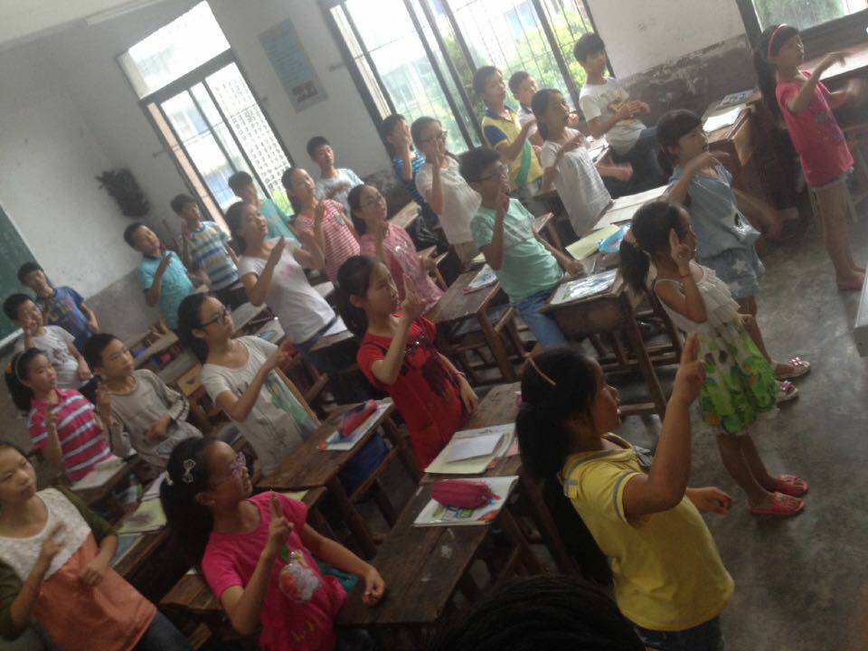 下午,志愿者教孩子们做手语。这是孩子们第一次接触到手语,虽然学习起来略显吃力,但是兴趣高涨。课后,有些不清楚个别手语比法的孩子们到办公室里单独询问志愿者们问题,志愿者们十分欣喜孩子们的认真程度。