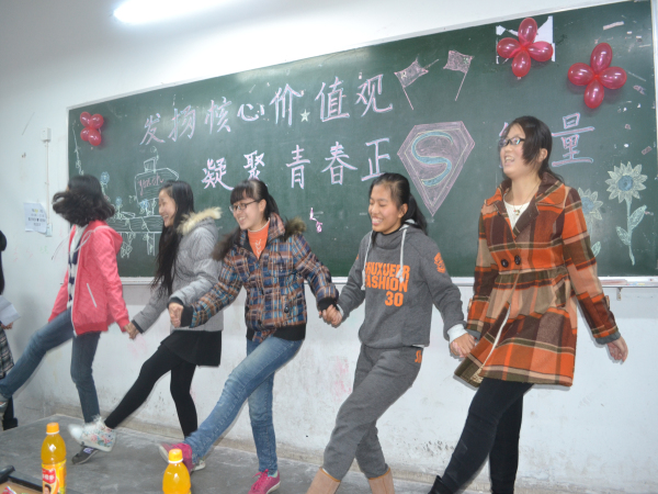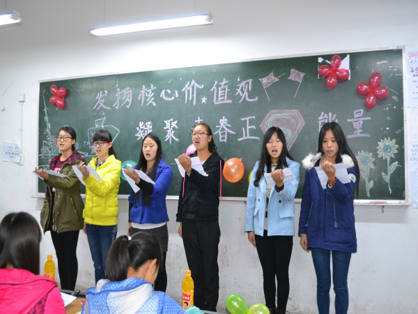 12:30,主题班会在同学们精心装扮的教室里正式开始。同学们纷纷一展才华,竟相表演精彩的节目。动听的歌曲充分表达了爱国正能量;小品表演既博得了同学们欢笑,同时也宣扬了社会主义核心价值观;动感的舞蹈更是点燃了现场气氛。与此同时,参与感极强的小游戏也拉近了同学们之间的距离。通过这次主题班会,同学们对社会主义核心价值观有了更加深刻的了解,对弘扬青春正能量充满了信心。
