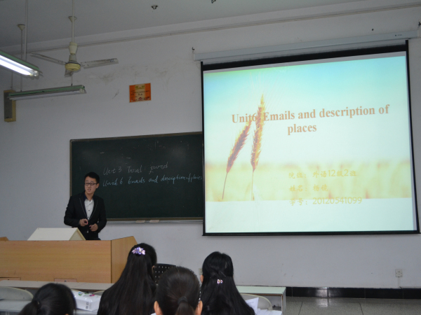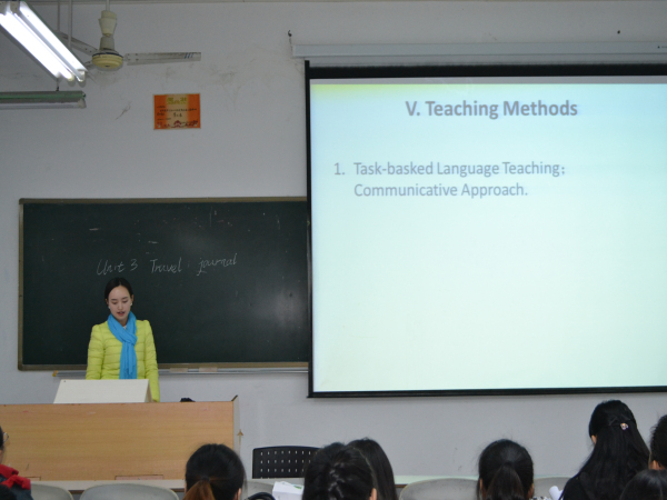 2013级6班岳楚陶第一个出场,她围绕“myself”这个单元,运用PPT,清楚明了地展示了她的教学过程、教学目标及作业设计。在整个过程中,选手充分运用了讲授法、演示法、练习法,赢得场下的阵阵掌声。之后选手陆续展示了自己的教学方案,比赛进行得有条不紊,每个选手都严阵以待。但令人遗憾的是,比赛过程中,有两位选手未能准确把握时间,以致于不能展示完自己的教学方案。