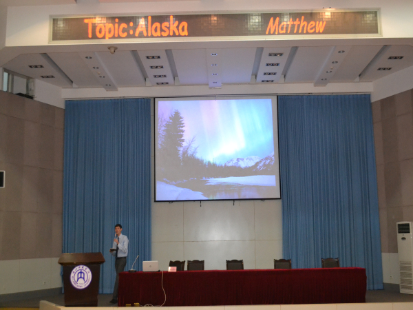 19:00,讲座正式开始。Mathew首先做了简短的自我介绍,同时也对到场听众表达了欢迎。讲座中,Mathew首先用提问的形式为大家介绍了阿拉斯加州的基本信息,让同学们对阿拉斯加州有了一个初步的了解。随后,Matthew用生动形象的PPT介绍了阿拉斯加的人文地理和生态环境。他提到,由于阿拉斯加特殊的地理位置,火车和飞机成为重要的交通工具。最后,他又介绍了阿拉斯加传统的一些活动。最后的同学提问环节,同学也问到了有关阿拉斯加食物、移民要求、福利待遇等问题,Mathew都一一做出了答。