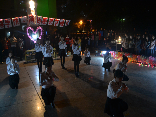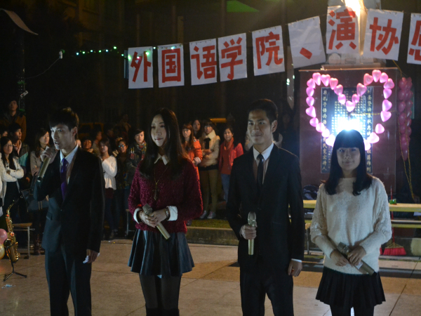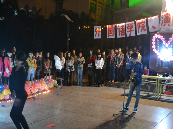 激情澎湃的啦啦操首先点燃了晚会的气氛。晚会的第一个“感恩父母”环节引起全场同学共鸣,争相表达自己对父母的感恩之情。手语舞蹈《爱因为在心中》无声胜似有声;小品《亲情的距离》叩响了在场所有观众的心弦,亲情的温暖流淌在会场的每个角落。随后是在场所有人的互动环节,游戏“抱一抱”让在场的外教与员工共同融合在爱的海洋。在最后的环节中,以浪漫纯洁的爱情为主题,改编的话剧《梁山伯与祝英台》让人捧腹大笑,萨克斯独奏《泰坦尼克号》让人心驰神往……