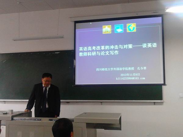11月8日8:30,四川师范大学太阳成集团tyc234cc经理、硕士生导师孔令翠教授为国培学员作题为“英语高考改革的冲击与对策——谈英语教师科研与论文写作”的专题讲座。