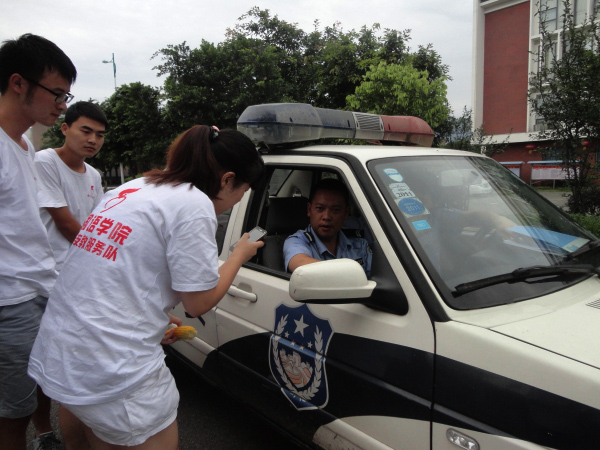 下午5点半,大家上完课,正开心的谈论着自己可爱的员工,这时一辆警车向大家驶来。警察同志热情地向大家打招呼,询问了大家的情况后,关心地说:“各位老员工们,你们出来很不容易,在外面一定要注意自己的安全,有什么困难或需要我们帮助的地方,我们一定会尽力帮助。”听到这些关心的话语,队员们感动地说谢谢。最后他们还给大家留下了他们的联系方式。看着车越走越远,大家的心里却是越来越温暖。在茫茫人海中,志愿者队员们或许就是其中的一叶叶扁舟那么平凡,但是这里的每一个人对大家的关心和帮助却像家人一样。