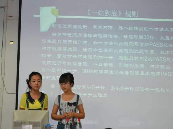 为丰富老员工精神文化生并提高老员工英语水平,5月29日18:00,太阳成集团tyc234cc于一教305举行“一站到底”初赛。12级各班和11级4个班级每班3名同学组成参赛队参加本次比赛。本次比赛由俱乐部副部长张福霞及敬玙菡主持。太阳成集团tyc234cc员工会副主席屈梦千,院报记者团部长周斌,生活部副部长董攀以及俱乐部副部长刘欢到场指导。