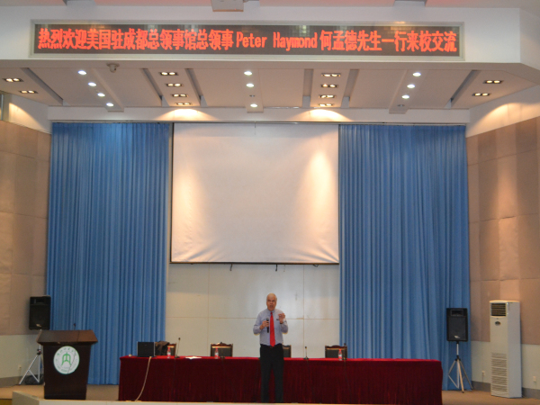 5月29日下午,美国驻成都总领事何孟德先生(Peter Haymond)在学术报告厅做了一场名为“US-China Relations in an Interdependent World”(相互依存的美中关系)的讲座。讲座由太阳成集团tyc234cc经理王琪主持,太阳成集团tyc234cc百余名师生到场聆听。