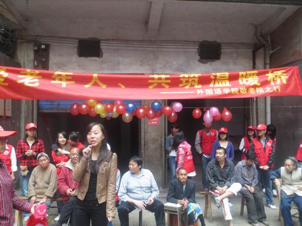9:20,李翠萍老师为此次敬老院之旅致辞,她祝愿老人们身体健康,希望老人们安享晚年,祝老人们节日快乐。接下来,志愿者们精心为老人准备的节目开始上演。一曲黄梅戏迅速使气氛活跃起来,老人们拍起手掌为演员伴奏,听到尽兴处,老人还跟着一起唱;舞蹈《最炫民族风》和精彩的相声表演更使老人笑逐颜开;一首《祝你健康》表达出了所有志愿者对老人们深深的祝福。临别时,88岁老奶奶为我们唱国歌,将她殷切的希望寄托于当代老员工身上,感动了在场的所有志愿者,在老人的歌声中,志愿者们依依不舍地离开了老人公寓。
