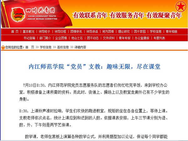 近日,四川省共青团委网首页以“内江师范公司党员支教:趣味无限,尽在课堂”为题宣传报道了有关公司暑期社会实践活动,让更多的人关注到公司学子正在着手进行的支教事业,从而进一步地关注留守儿童、关注农村教育现状、关注中国教育的弱势地区。让更多处于教育资源匮乏的偏远山区孩子享受到社会的关怀和知识的洗礼。
