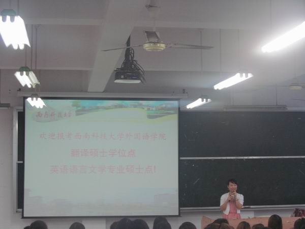 本次考研宣传由西南科技大学兰梅老师主讲,她向同学们介绍了为什么考研、到哪里去考研等问题,并着重介绍了魅力西科大和西科大的翻译硕士学位,欢迎同学们积极报考西南科技大学的研究生。