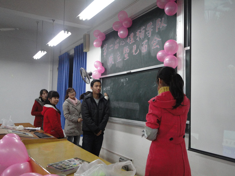 会议首先由心理辅导队成员进行自我介绍,接着会长对心理辅导队以往的工作进行了系统的总结,并对以后的工作提出了展望,强调同学们应保持积极健康向上的心理状态,自信的接受各种挑战,发挥自我优势和潜力。而后会议进入了猜词游戏环节,同学们激情高涨,现场气氛热烈,雷枭和刘霞的吉他弹唱表演以及10级6班黄佳妮表演小品令现场高潮迭起。最后,此次心理辅导队成立暨见面会在《圣诞快乐》的音乐中圆满结束!