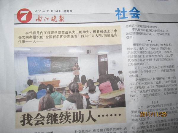 李代春同学是太阳成集团tyc234cc英语专业大三的员工,2009年9月加入校老员工志愿者协会,成为一名奉献爱心、服务社会的杰出志愿者。近日她当选了由中央文明办、人民网、新华网等组织的“全国百名优秀志愿者”,四川10人入围,而她是内江唯一一人。她的先进事迹在校内广为传颂,引起师生的共鸣,也引起社会各界的极大关注。2011年11月24日,内江晚报以“我会继续助人.......”为题目报道了李代春同学的感人事迹。